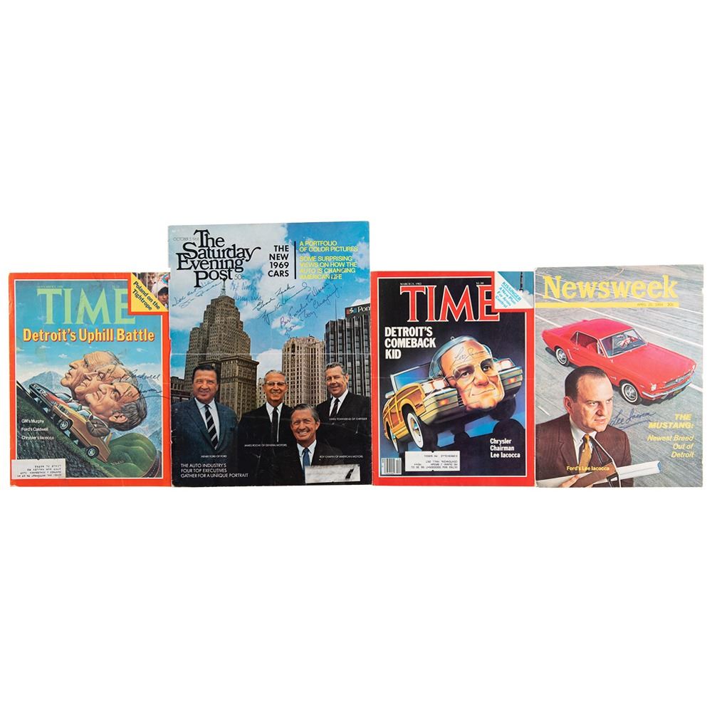 Four magazine front covers from Time, Newsweek, and the Saturday Evening Post, 8.25 x 11 and 10.25 x 13.25, each honoring notable automobile executives, with two signed in felt tip by Lee Iacocca, one signed by Iacocca and Philip Caldwell, and another, the Saturday Evening Post cover, signed by four: Henry Ford III, James Roche, Lynn Townsend, and Roy Chapin. In overall very good to fine condition, with creasing, mailing folds, and a removed mailing label.