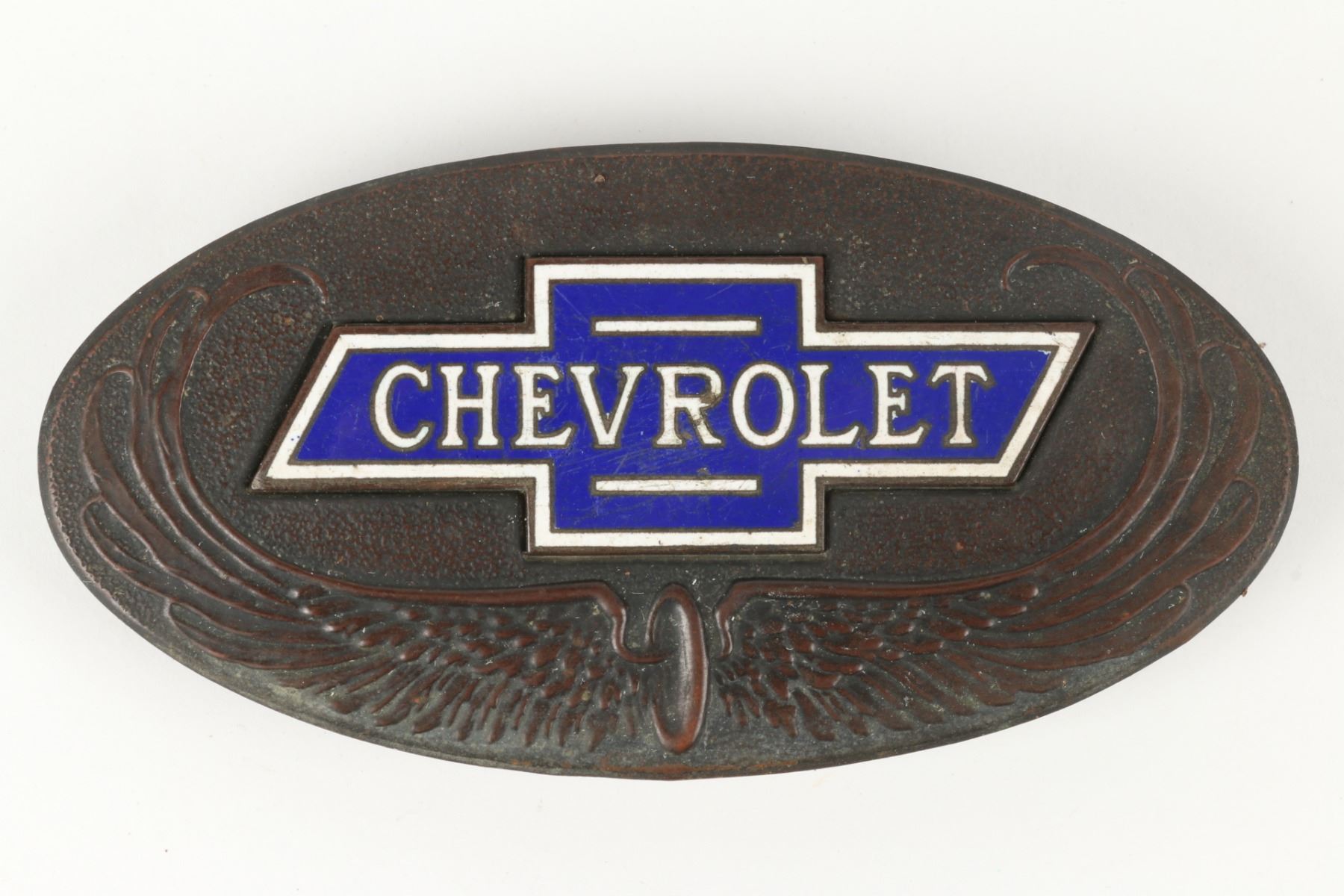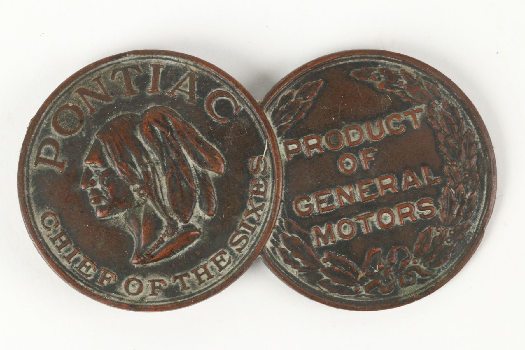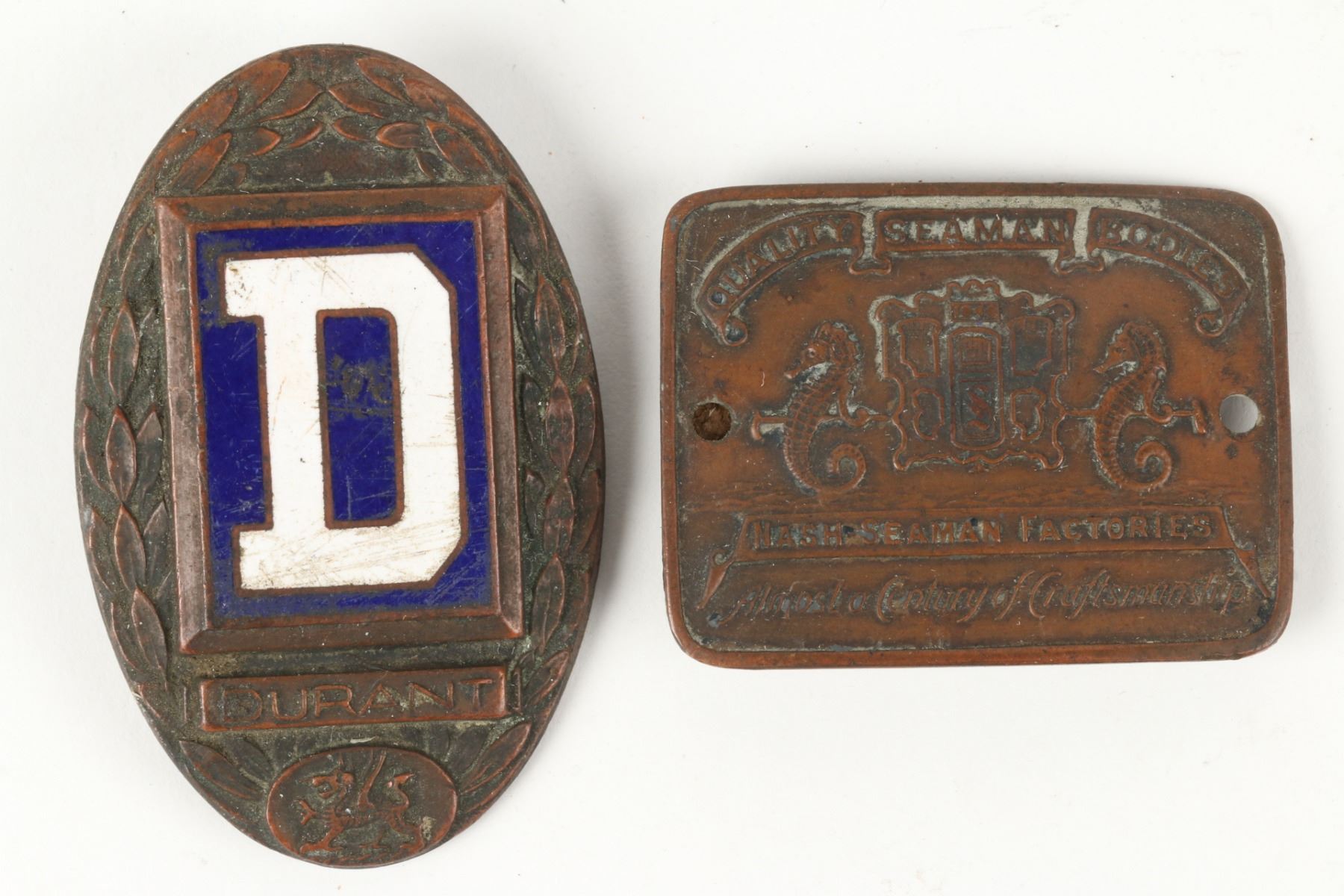 American and Canadian. Circa 1920s. Enamelled and embossed copper and brass composition. Pontiac, Durant, Chevrolet, Nash-Seaman, Studebaker. 1" to 3". Tarnish and minor brassing. $100-200.