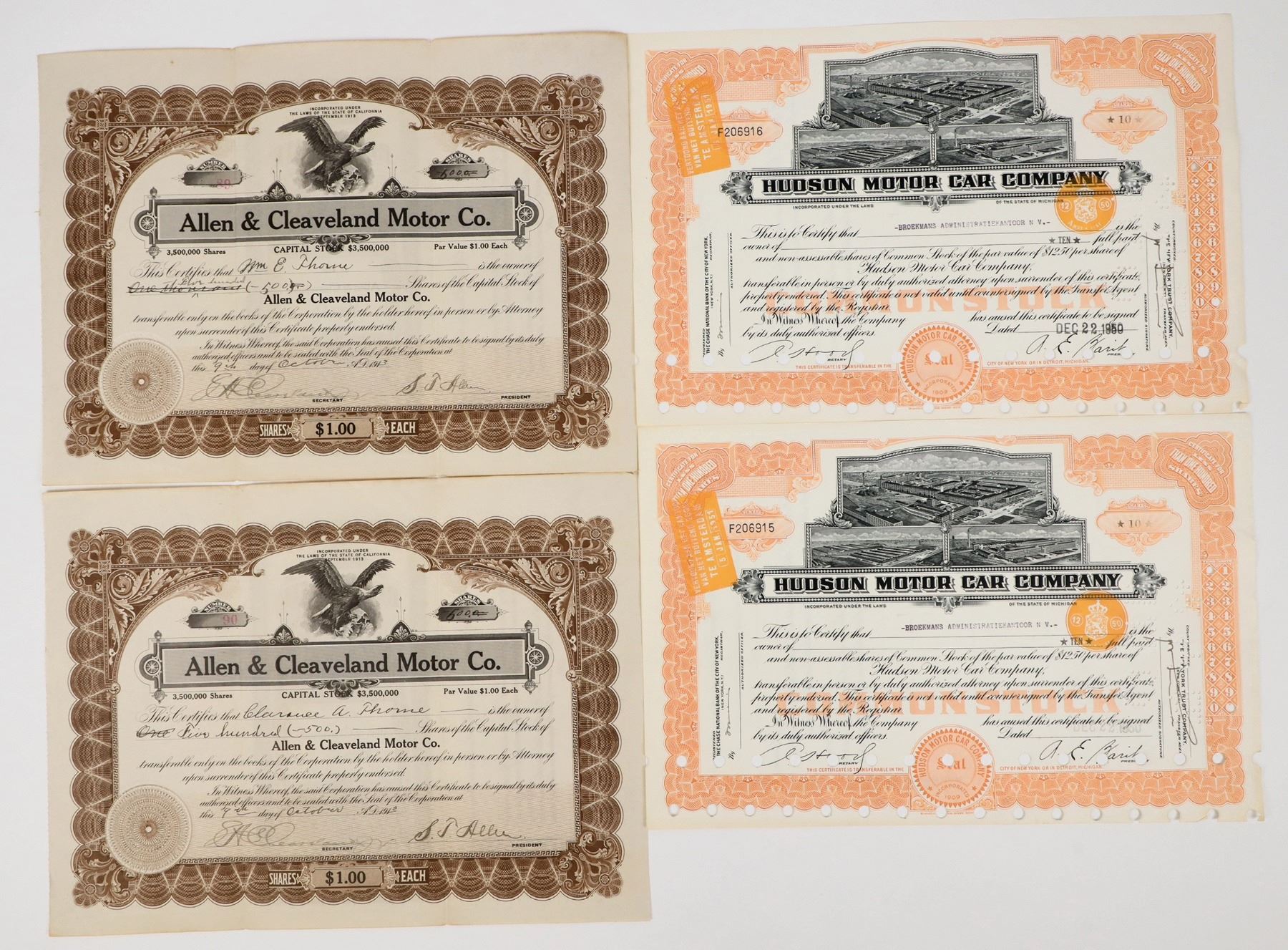 Lot of 4. I/U. I/C/ Issued 1913/50. 1. I/U, Allen& Cleveland Motor Co., issued 1913. Internet revealed no information on this stock. There were two companies : The Allen Motor Car 1913-22 and the Cleveland Automobile Co 1913-22. No merger of the two. VF cond. 2. I/C, EF cond. Hudson Motor Car Co., issued 1950, vignette of plant, Hamilton BNC printer. Heavy punch hole cancellation.