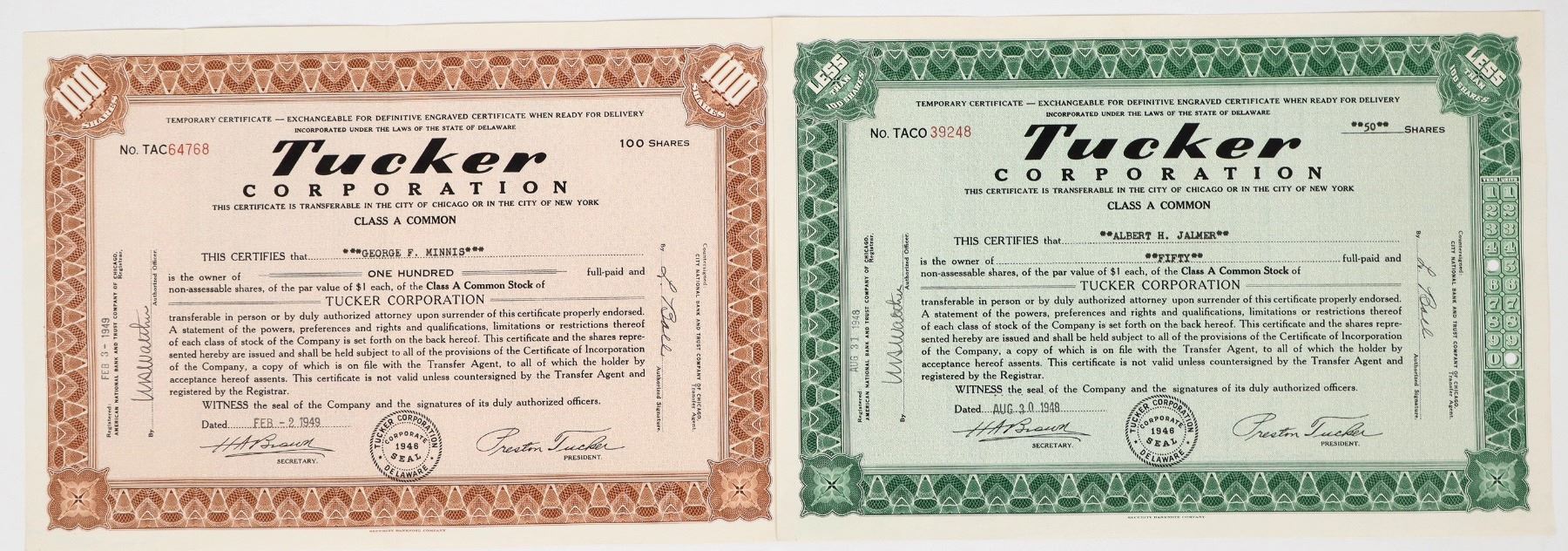 Lot of 2. I/U. Issued 1948/49. 1. Tucker Corporation, no vignette, imprinted seal, Security BNC printer. EF or better. 2. Duesenberg Automobile & Motors Co. Inc. , vignette allegorical figures , The Brown Green Co. printer. VF cond.