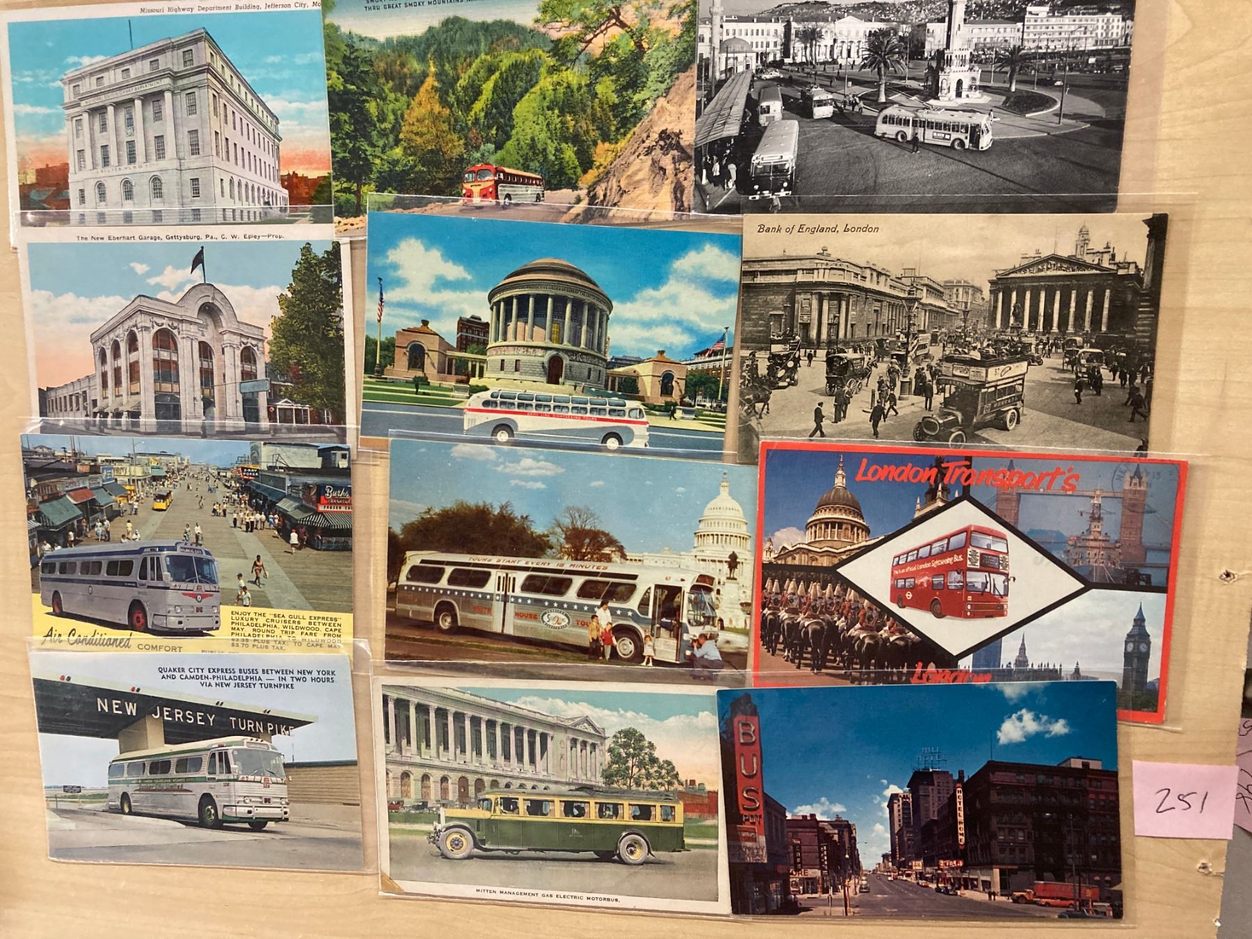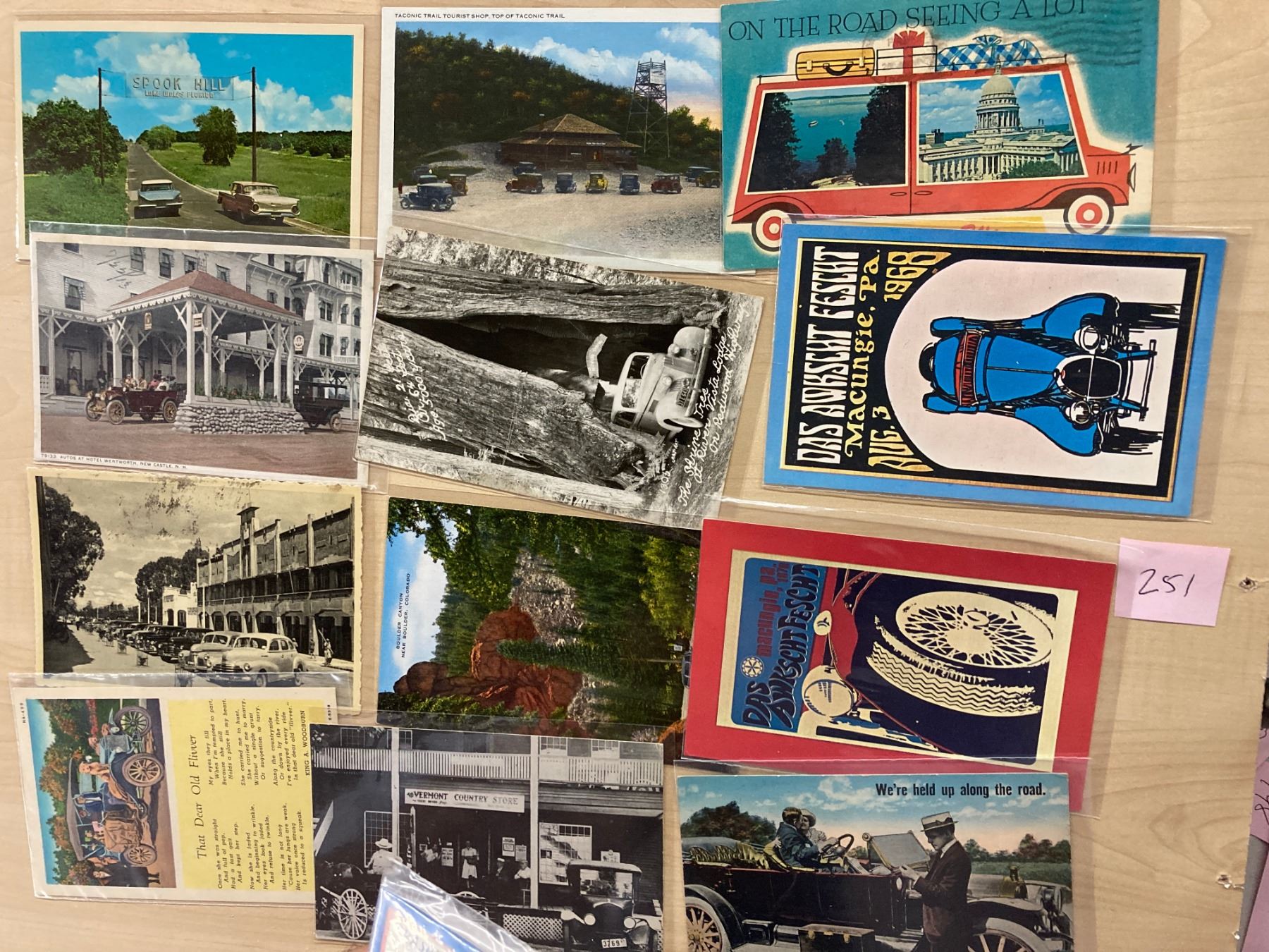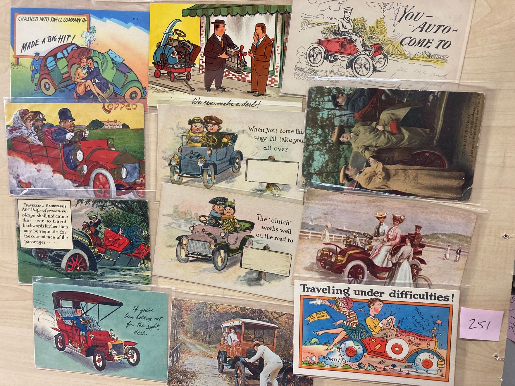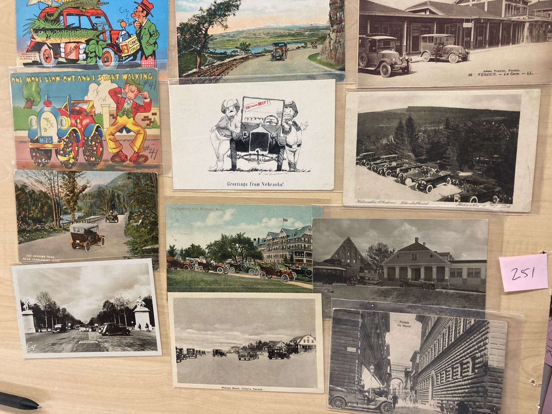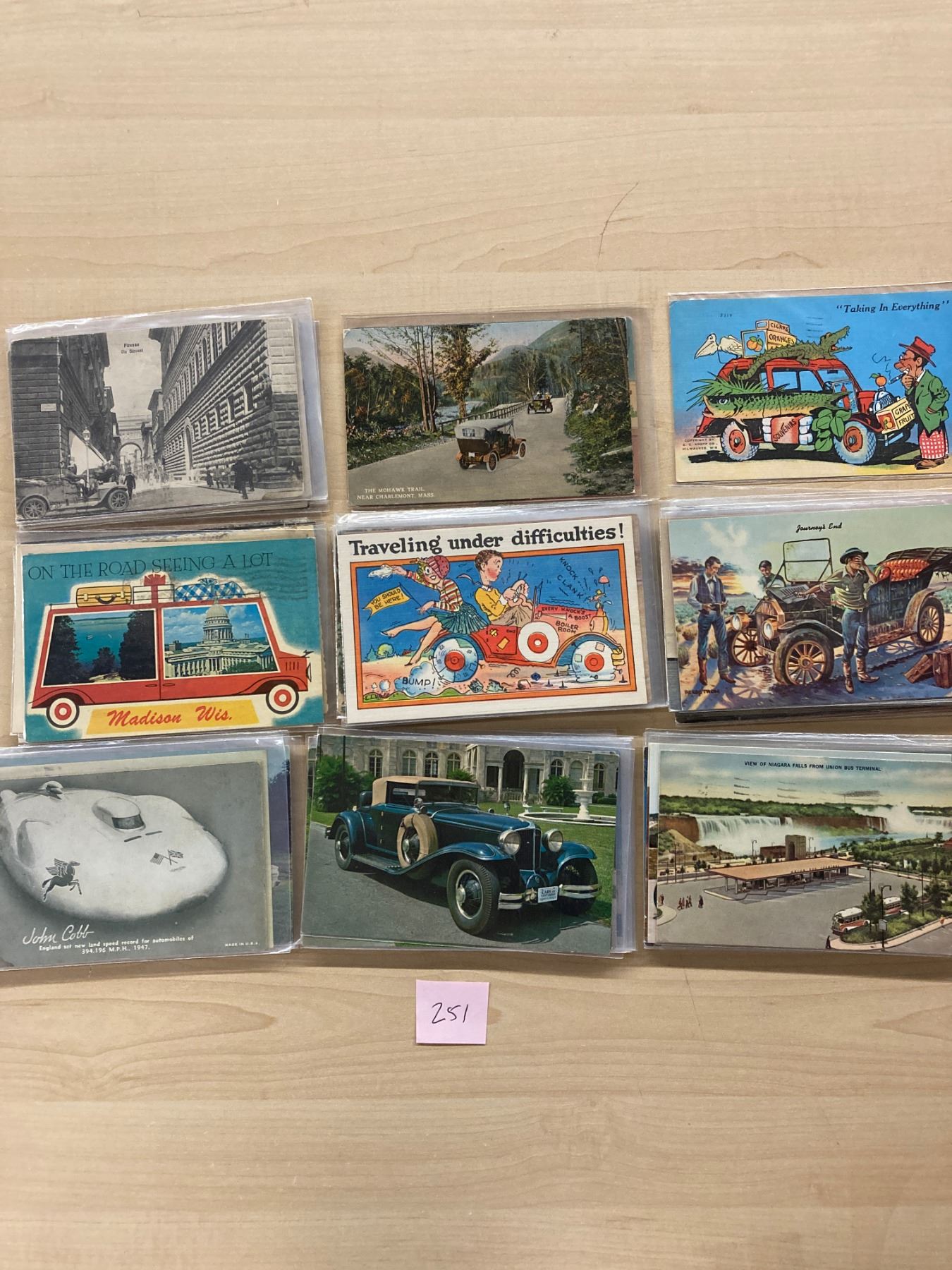 Over 95 cards of automobiles on postcards. Street scenes, comics, greetings, antique cards, etc. Early to standard size chrome.