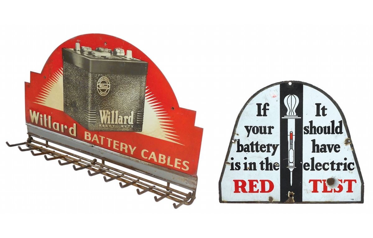 Automobilia, display rack & sign (2), Willard Battery Cables folding rack, embossed metal, VG cond, 12"H x 17"W & Battery Test sign, diecut porcelain, c.1936, VG cond w/couple sm chips, 11.25"H x 13.25"W.