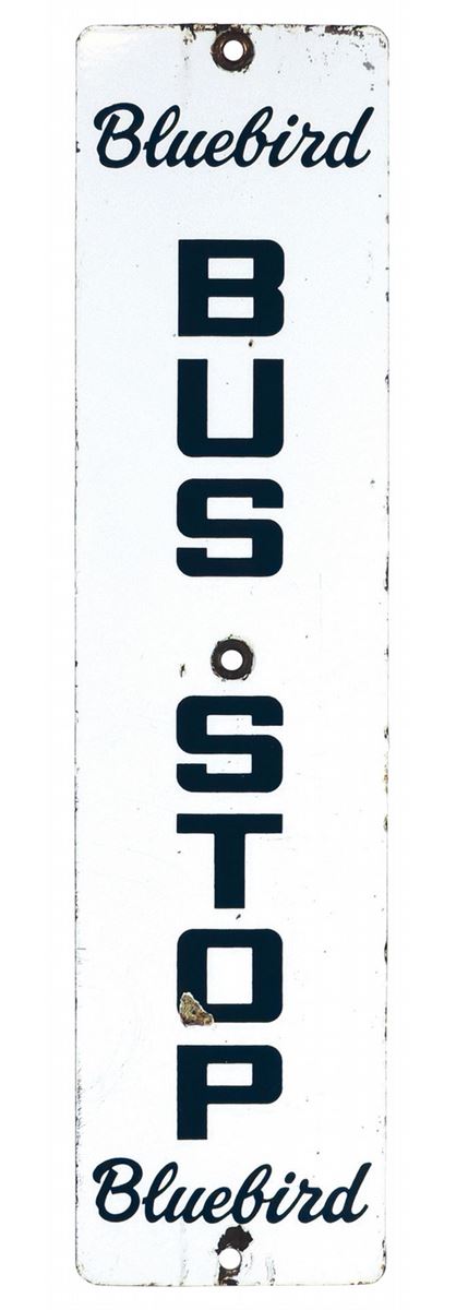 Automobilia, sign, Bluebird Bus Stop, porcelain, VG+ cond, 24"H x 6"W.