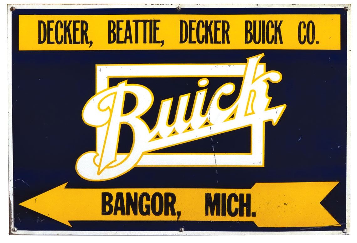 Automobilia, sign, Buick w/arrow pointing the way to Decker Buick Co.-Bangor, Mich., embossed metal w/great color & shine, Exc cond w/minor wear & scratch, 13.5"H x 19.5"W.