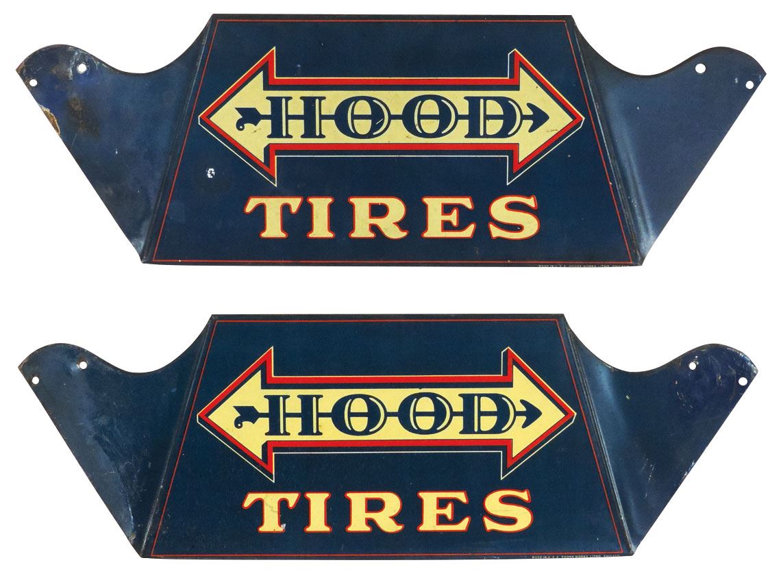 Automobilia, tire display, Hood Tires, litho on metal by Shonk Works-Chicago, 2-pc never-used display in VG/Exc cond, 7.5"H x 22.25"W.