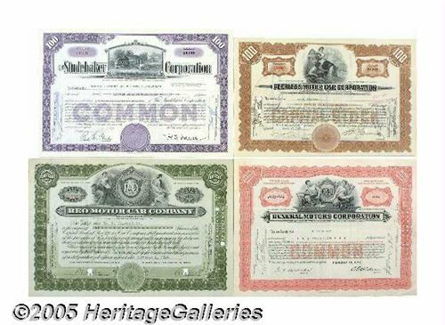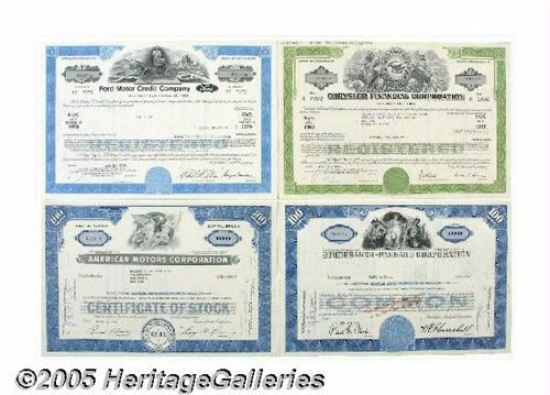 <B>Automotive Collection of 8 Stocks and Bonds</B></I> Includes the following: 1. Reo Motor Car automotive stock. Michigan, 1924, olive. Beautifully engraved by Republic Bank Note - Philadelphia. Especially important car maker founded by R. E. Olds of Oldsmobile fame. Interesting to note that the logo on this stock was used on an album cover by the very famous rock group REO Speedwagon. 2. American Motors Corporation automotive stock. Maryland, 1960, blue. Attractively engraved by American Bank Note. 3. General Motors Corporation automotive stock. Michigan, 1951, red. Beautifully engraved by E. A. Wright Bank Note. Scarce. 4. Peerless Motor Car Corporation automotive stock. Virginia, 1929, brown. Superb engraved graphics by American Bank Note. 5. Studebaker Corporation automotive stock. Michigan, 1954, purple. Great engraving of the first Studebaker carriage making blacksmith shop. Especially nice quality by American Bank Note. 6. Studebaker-Packard Corporation automotive stock. Michigan, 1958, blue. Attractive engraving by American Bank Note. 7. Chrysler Financial Corporation automotive bond. Michigan, 1978, $3,000 bond, green. Nice engraving by Security-Columbian Bank Note. 8. Ford Motor Credit Company automotive bond. Delaware, 1975, $25,000 bond, blue. Engraved vignette of Henry Ford posed with an early Ford prototype car by Security-Columbian Bank Note. Very popular. Lot:253
