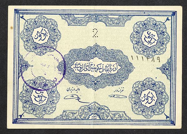 Iranian Azerbaijan. 2 Tomans. P-S103. Blue on light green underprint, '2' perforated at top center. Purple hand stamp at left. Extremely Fine.