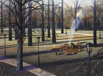 Artist: Hiro Yamagata Title: Autumn Afternoon Medium: Original Serigraph Year:1988 Size: 34" by 42" unframed Paper: 320g Coventry Rag No. of Colors: 53 Edition Size: Edition Size: 566, Artist's Proofs: 1-50/50, Printer's Proofs: 1-10/10, Museum: 1-25/25 Screens: Destroyed Printer: Maxwell-Nova Fine Arts, New York Publisher: Martin Lawrence Limited Editions Inc. Van Nuys, CA