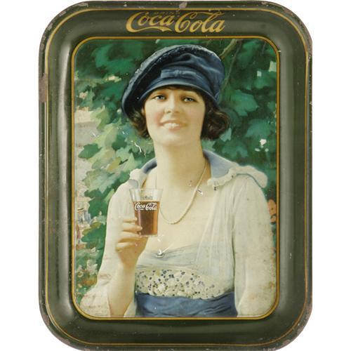 <B>Autumn Girl Coca-Cola Tray.</B></I> This '20s model was used to promote Coca-Cola at the fountain and was also featured on the 1922 calendar. With an excellent look, the tray shows several minor scratches and wear along the left edge of the scene. Nothing detracts from the model's starry-eyed look and blushing smile enticing us to "Drink Coca-Cola." Certainly one of the nicer examples of this tray. <BR><BR><B>Important notice