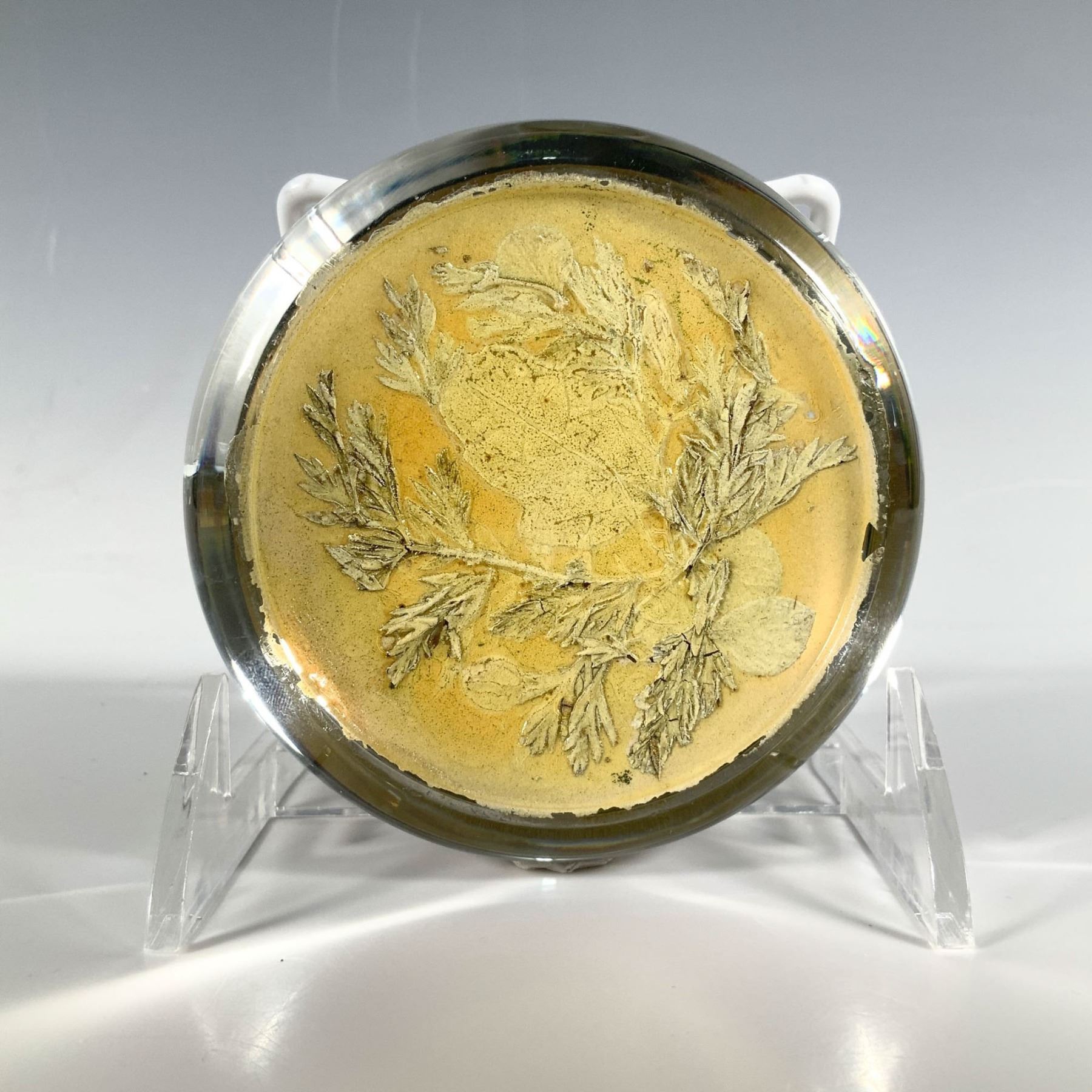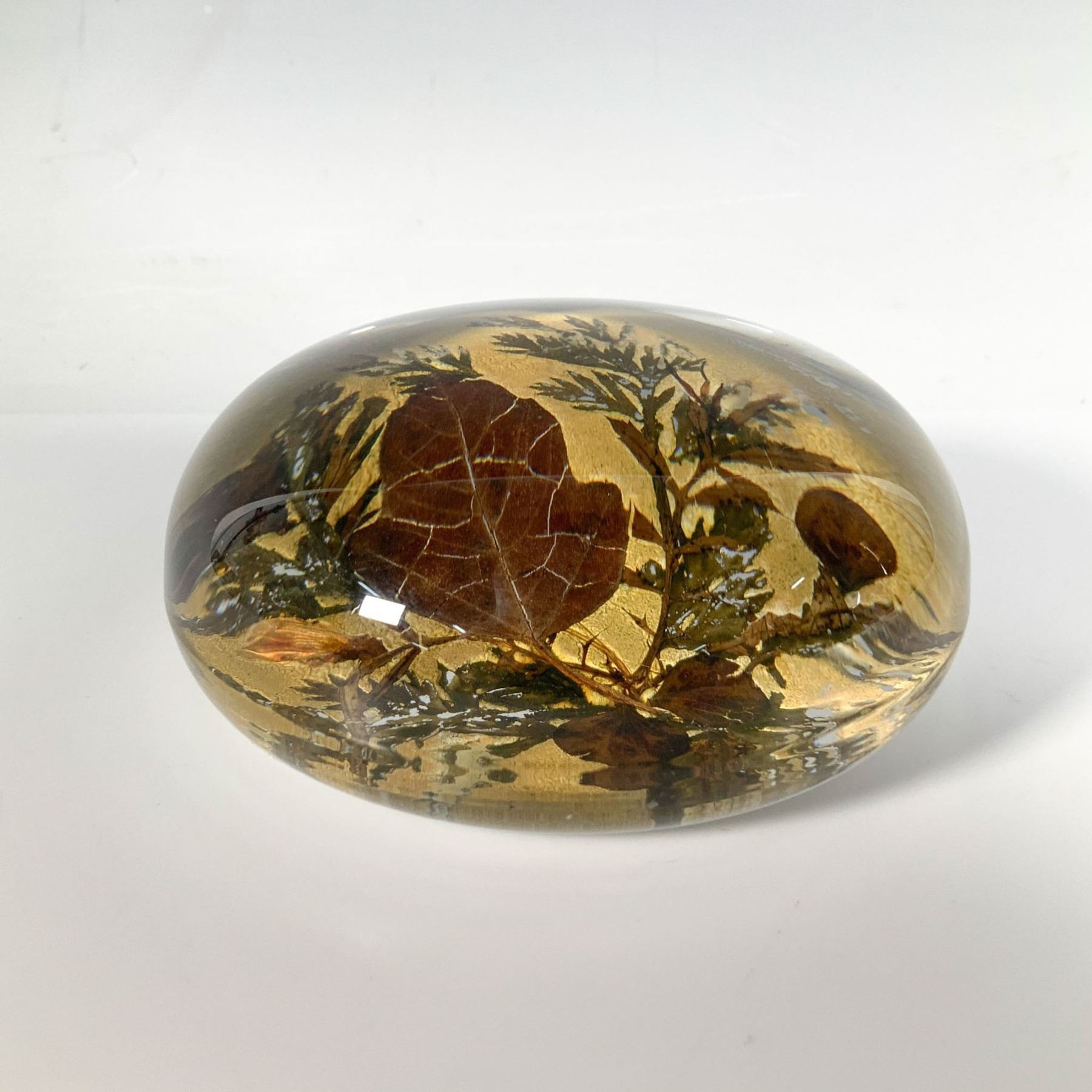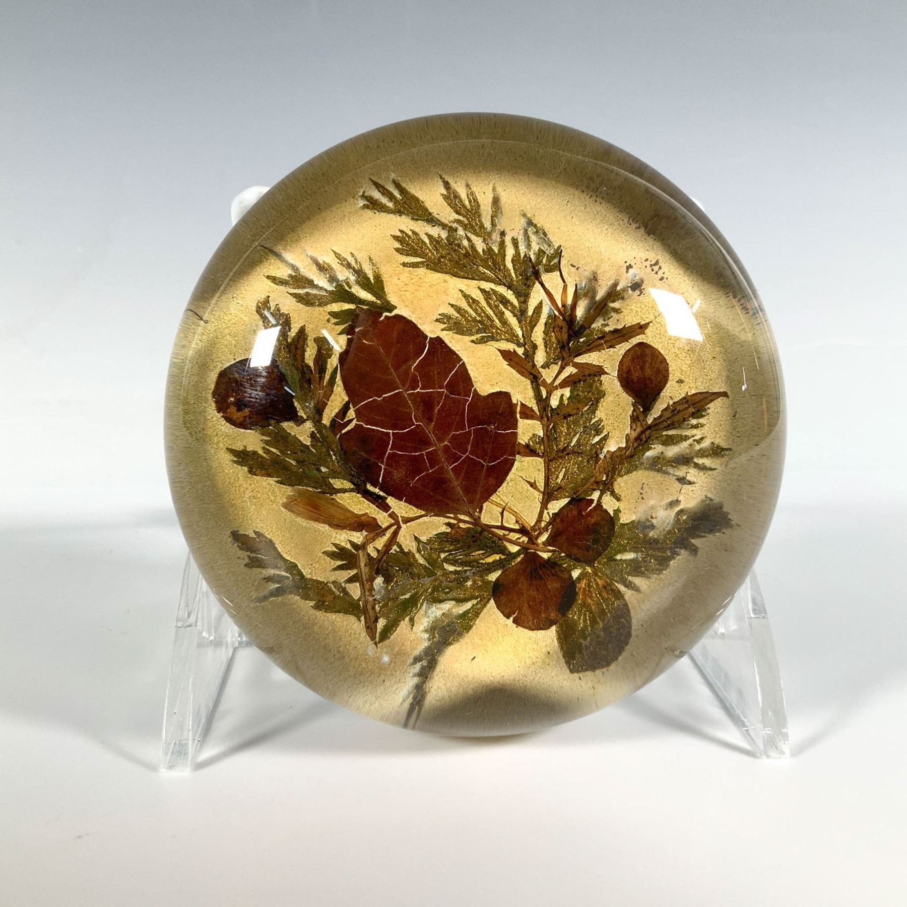 A clear paperweight with a base showcasing vibrant brown autumn leaves and gilded tree branches.