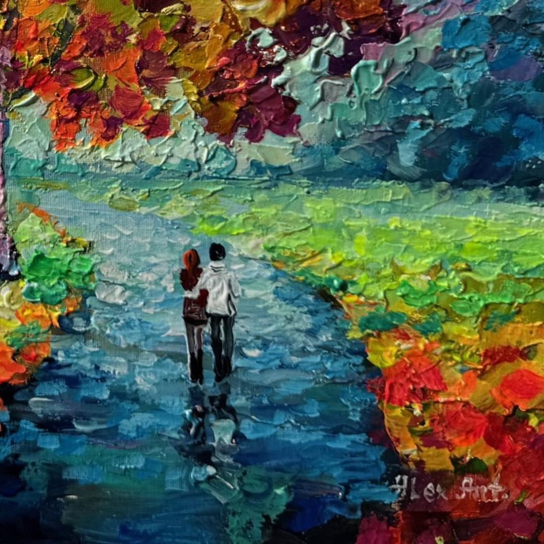 "Autumn Romance" is an original oil painting on stretched canvas by Alexander Antanenka. Hand signed by the artist, the piece comes with a letter of authenticity. Measures approximately 20" x 20" (image).