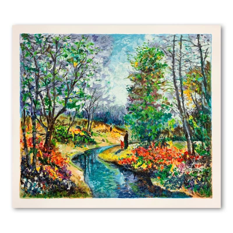 "Autumn Stream" is a limited edition serigraph on paper by Dimitri Polak (1922-2008). It is numbered and hand signed and includes a letter of authenticity. Measures approximately 19" x 23" (image).