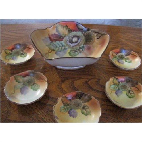 Autumn motif Nippon Noritake master relish with individual salts (or condiment) bowls.