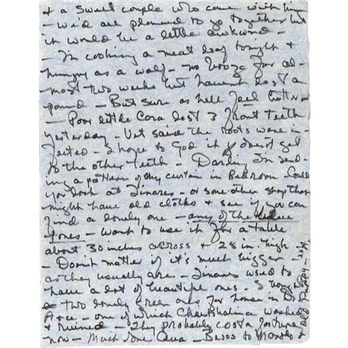 <B>Ava Gardner Handwritten Letter.</B></I> An undated, handwritten letter on expensive blue personal stationery, written by Gardner in black ink to "Harris." In it she discusses Sinatra, her dog, redecorating her home, and that she'd had "No booze in almost two weeks but haven't lost a pound." "Harris" was most likely Harris Williams, Ava's friend in the Foreign Service who assisted her with her move to London in 1968. The letter is signed "Much love Ava" and is a great example of her handwriting, in Excellent condition. Also included is a small fabric swatch mentioned in the letter. <I>From the Ava Gardner Estate.</B></I><I>From the Ava Gardner Estate.</B></I><BR><BR><b>Shipping:</b> Small Flat (<a target="_blank" href="http://www.heritageauctions.com/common/shipping.php">view shipping information</a>) <BR><BR><B>Important notice:</