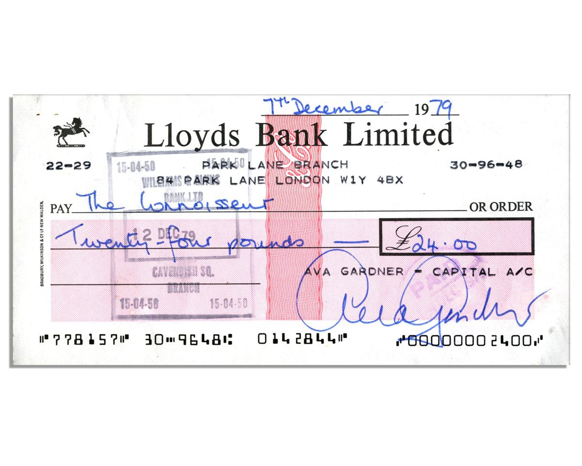 Ava Gardner signed personal check, made out in her hand. The glamorous star of such notable films as ''The Sun Also Rises'' and ''The Night of The Iguana'' signs her name ''Ava Gardner''. She dates the check 7 December 1979. Measures 6'' x 3''. Creasing and standard bank cancellations, else near fine.