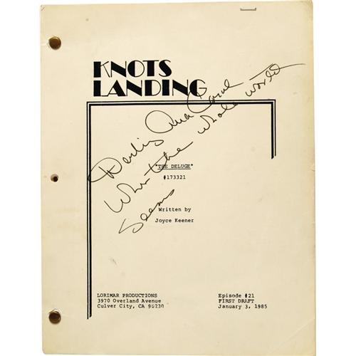 <B>Ava Gardner "Knots Landing" Episode Script.</B></I> A 62-page, first draft script for season 6, episode #21 ("The Deluge"), dated January 3, 1985, with notes handwritten on the cover by Ava Gardner. Ava ultimately did not appear in the episode, but did have a recurring role in season 6, episodes 27 and 28 of the primetime soap opera. In Very Fine condition with some discoloration to the cover and overall mild to moderate wear. <I>From the Ava Gardner Estate.</B></I><BR><BR><b>Shipping:</b> Books & Catalogs (<a target="_blank" href="http://www.heritageauctions.com/common/shipping.php">view shipping information</a>)
