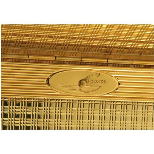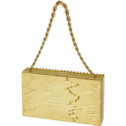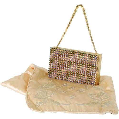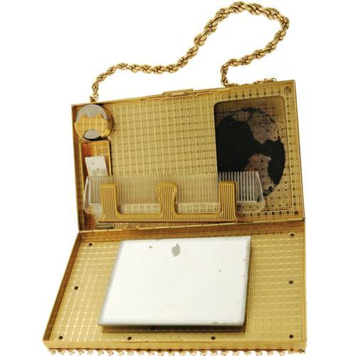 <B>Ava Gardner Owned Evans Vanity Box Evening Purse.</B></I> This beautifully constructed, vintage Evans evening purse and vanity box is truly a gem - with a blue and green bejeweled front, a textured back, and a heavy brass chain, the rectangular purse is utilitarian functionality mixed with classic elegance. The front area holds a brass-lined comb, coin holder, lipstick and powder case area, and a mirror (unattached). The opposite side was designed for holding cigarettes, and has the Evans stamp along the hinge. The gold chain's drop measures 4.5", and the purse itself measures 5.5" wide and 3.5" high. The interior is in Good condition with missing powder puff and lipstick case, and the exterior is in Very Good condition with no dents or scratches, with working clasps. <I>From the Ava Gardner Estate.</B></I><BR><BR><b>Shipping:</b> Clothing, Costumes & Jerseys (<a target="_blank" href="http://www.heritageauctions.com/common/shipping.php">view shipping information</a>)