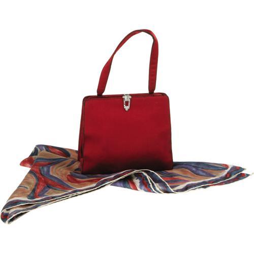 <B>Ava Gardner Owned Evening Bag and Silk Scarf.</B></I> With the original mirror and matching coin purse, this elegant burgundy evening bag is lined in soft ivory leather. The handle drop measures 6", and the bag itself measures 8" at its widest point and 6.5" high. In Very Fine condition with missing rhinestones on clasp, and minor damage to internal frame. Also included is a silk scarf with hand-rolled edges and abstracted, organic designs in muted earth tones. Measuring 26.5" x 26", the scarf is in Good condition with signs of wear and minor stains along edges. <I>From the Ava Gardner Estate.</B></I><BR><BR><b>Shipping:</b> Clothing, Costumes & Jerseys (<a target="_blank" href="http://www.heritageauctions.com/common/shipping.php">view shipping information</a>)