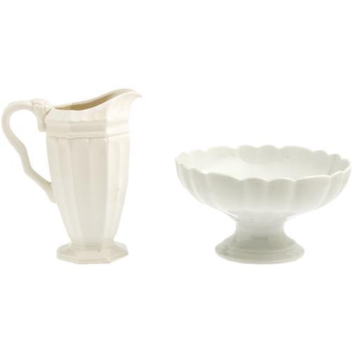 <B>Ava Gardner Owned Fruit Bowl and Pitcher.</B></I> Includes a 8.5" white ceramic pitcher and a white ceramic fruit bowl (5" high, 9" in diameter), both in Excellent condition. <I>From the Ava Gardner Estate.</B></I><BR><BR><b>Shipping:</b> Hollowware/Pottery/Glass, Small (<a target="_blank" href="http://www.heritageauctions.com/common/shipping.php">view shipping information</a>)