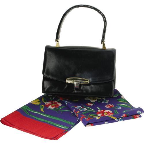 <B>Ava Gardner Owned Koret Handbag and Floral Scarf.</B></I> Renown for their craftsmanship and classic designs, Koret was a popular handbag of choice in the '40s, '50s and '60s. This handsome example must have been one of Ava's wardrobe staples, as there are minor signs of wear to the exterior and ink and lipstick marks along the interior. With a locking front clasp and adjustable handle (the drop ranges from 5.5" to 11.5"), the bag is 9" wide by 6.5" high, and is lined in striking red leather. In Very Good condition with two interior pockets, one zippered, and the Koret logo embossed in gold along lining. Also included in this lot is a blue floral silk scarf measuring 44" x 15". in Excellent condition. <I>From the Ava Gardner Estate.</B></I><BR><BR><b>Shipping:</b> Clothing, Costumes & Jerseys (<a target="_blank" href="http://www.heritageauctions.com/common/shipping.php">view shipping information</a>)