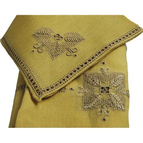 <B>Ava Gardner Owned Table Cloths and Napkins Set.</B></I> Includes one small, square yellow table cloth, one large yellow table cloth, eight yellow dinner napkins, and six yellow cocktail napkins, all linen with off-white embroidery. In Excellent condition.<I>From the Ava Gardner Estate.</B></I><BR><BR><b>Shipping:</b> Clothing, Costumes & Jerseys (<a target="_blank" href="http://www.heritageauctions.com/common/shipping.php">view shipping information</a>)