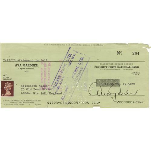 <B>Ava Gardner Signed Check.</B></I> A personal check for the amount of £12.54, dated February 27, 1970 and signed by Gardner in black ink. In Fine condition with the usual bank cancellation stamps, a couple of fold creases, and mild wear, tear, and tanning, none of which affects the signature. Also included is a vintage b&w 3.5" x 5.5" photo with a printed signature, in Very Fine condition with mild wear and some tanning to the bottom corners.<I>Accompanied by LOA from PSA/DNA.</B></I><BR><BR><b>Shipping:</b> Flat Material, Small (<a target="_blank" href="http://www.heritageauctions.com/common/shipping.php">view shipping information</a>) <BR><BR><B>Important not