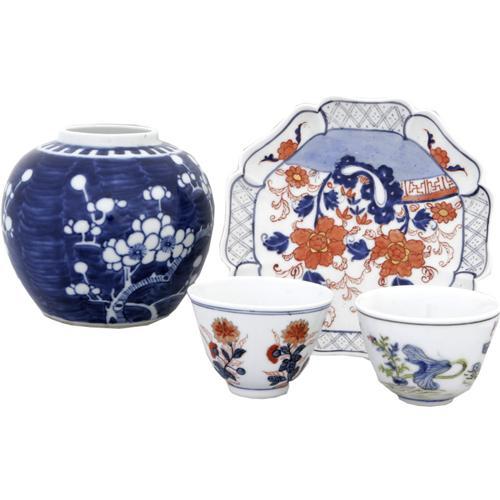 <B>Ava Gardner Teacups, Vase, and Plate.</B></I> Included are a brown and blue teacup with hand-painted Japanese design, an additional tea cup with a similar design incorporating green, a 6.25" white plate with hand-painted oriental design, and a 4.5" vase with blue and white oriental design. In overall Excellent condition. <I>From the Ava Gardner Estate.</B></I><BR><BR><b>Shipping:</b> Hollowware/Pottery/Glass, Small (<a target="_blank" href="http://www.heritageauctions.com/common/shipping.php">view shipping information</a>)