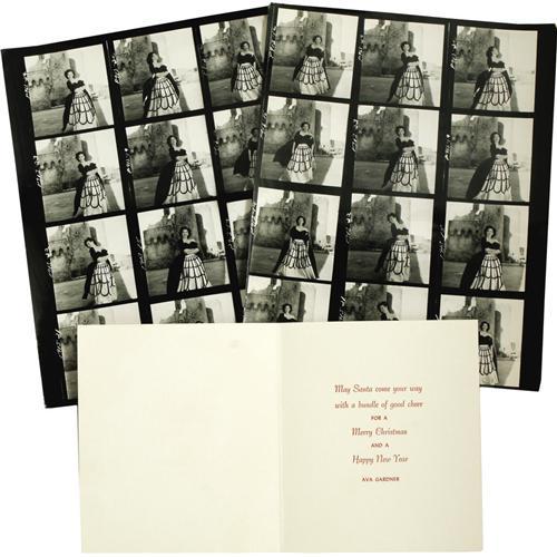 <B>Ava Gardner Photo Proofs from "Vogue" Magazine and Christmas Card.</B></I> This 8" x 10" sheet of photo proofs features 12 shots of Gardner posing in an evening gown in front of a castle. These proofs are from a 1953 <I>Vogue</B></I> magazine shoot by Norman Parkinson, famed fashion photographer from Great Britain, who did many <I>Vogue</B></I> shoots. The photos are accompanied by a personalized Christmas card custom printed for Gardner. Both are in Excellent condition with very light wear. <I>From the Ava Gardner Estate.</B></I><BR><BR><b>Shipping:</b> Small Flat (<a target="_blank" href="http://www.heritageauctions.com/common/shipping.php">view shipping information</a>)