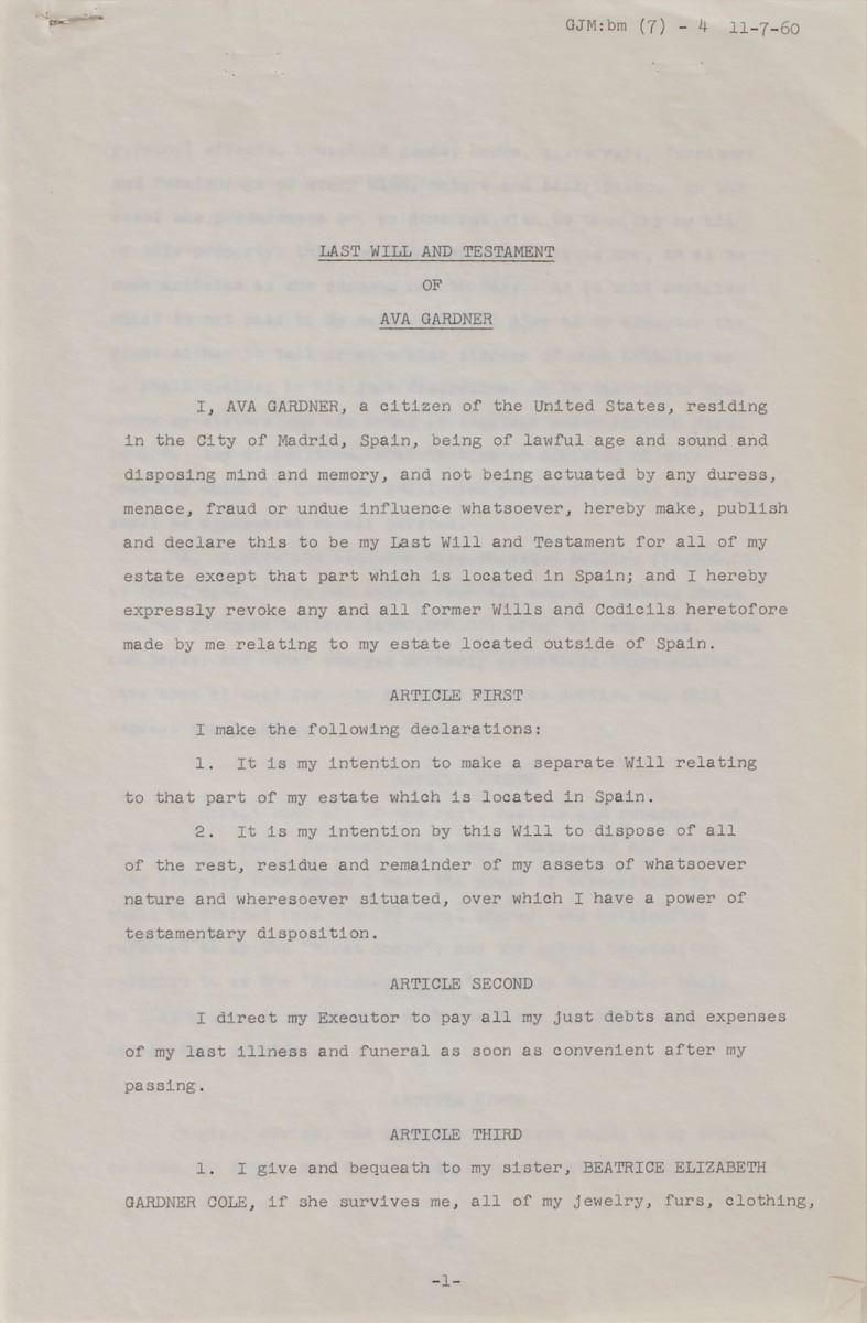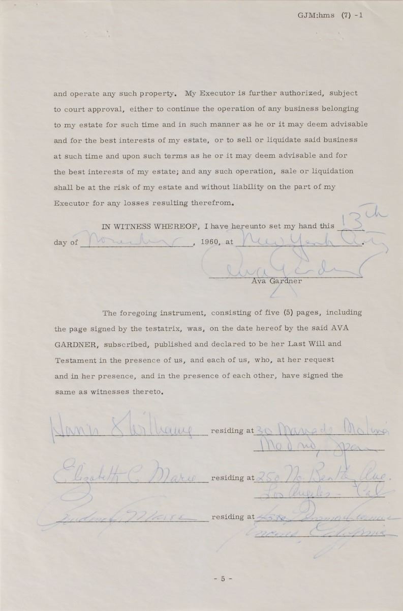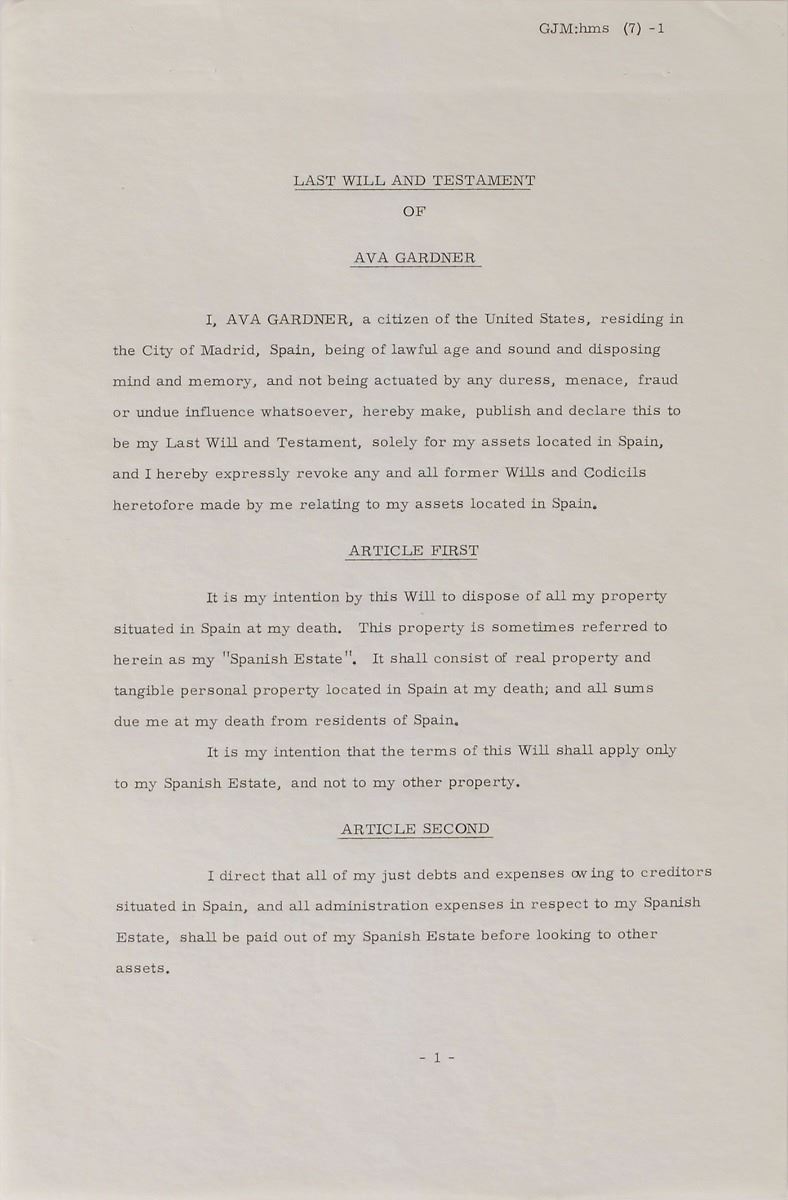 Two rare DSs related to the final wishes of Ava Gardner, both 8.5 x 13, November 13, 1960. The first, five pages, a last will and testament “solely for…assets located in Spain,” in which the actress devises and bequeaths her “entire Spanish Estate” to her sister Beatrice Elizabeth Gardner Cole. Signed and dated at the conclusion in blue ballpoint by Gardner, and countersigned by her executors. The second, twenty pages, a last will and testament for all of Gardner’s estate “except that part which is located in Spain,” in which she gives and bequeaths all her “jewelry, furs, clothing, personal effects, household goods, books, silverware, furniture and furnishings of every kind” to her aforementioned sister, $5,000 to Larry Tarr, and a lot of four trust shares to her other siblings. Signed and dated at the conclusion of page nineteen in blue ballpoint by Gardner, and countersigned on the detached final page by her executors. In overall fine condition. Beatrice ‘Bappie’ Gardner Cole shared a strong relationship with her younger celebrity sister, and even lived with her during Gardner’s first few years as a starlet with MGM. Bappie’s former husband, Larry Tarr, snapped many of the publicity photos that would jumpstart the young actress’ career. An affecting pair of documents from one of Hollywood’s most adored yet reclusive screen legends, revealing the short list of names she held most dear during her lifetime—Gardner died at the age of 67 on January 25, 1990; Bappie would outlive her younger sister by three years.