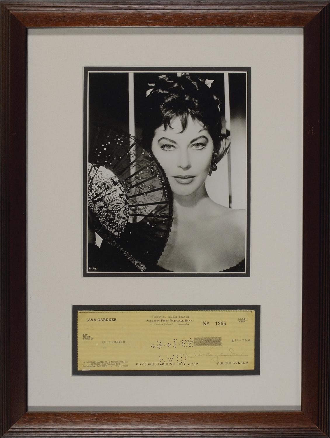 Check, 8.5 x 3, filled out in type and signed by Gardner, payable to Ed Schaefer for $144.56. Double-matted with a sultry glossy image and framed to an overall size of 16.25 x 21.25. A few light bends, expected bank cancellations punches and stamps with one punch touching the first letter of her name, and the signature a bit light, otherwise in fine condition.