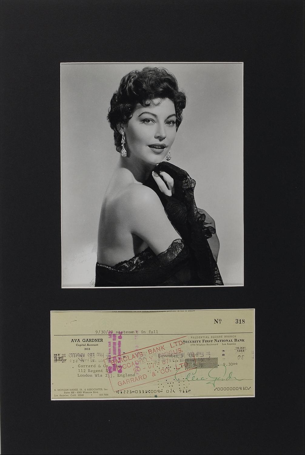 Personal check, 8 x 3.5, filled out in type and signed by Gardner, payable to Garrard & Co. Ltd. for $9.30, November 5, 1970. Matted with a glossy photo of Gardner, to an overall size of 12.25 x 18.25. In very good condition, with expected holes and stamps (one lightly affecting beginning of signature), several staples holes, a few creases, and show-through from stamps on reverse.