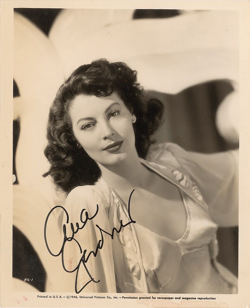 Glossy 8 x 10 Universal publicity photo of Gardner in a silk nightgown and robe, signed in black felt tip. In very good condition, with scattered creases, surface dings, and a couple of light red ink stains.
