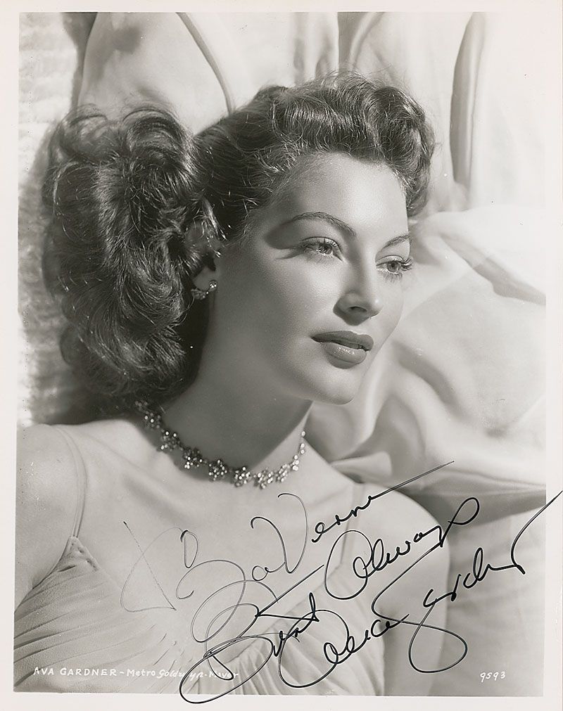 Beautiful glossy 8 x 10 photo of Gardner during her time with MGM, signed and inscribed in black felt tip, “To LaVerne, Best Always, Ava Gardner.” In fine condition.