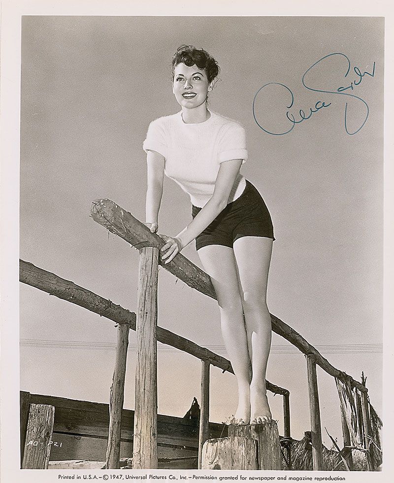 Attractive glossy 8 x 10 Universal Pictures publicity photo of Gardner posing on a fence, signed in black felt tip. In fine condition, with a bit of rippling to lower edge.