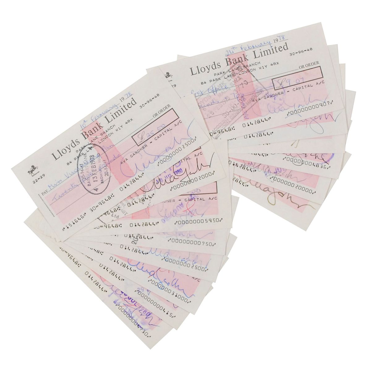 Nineteen checks, ranging in date from 1976–1980, all signed by Gardner (with five checks also filled out in her hand). Cancellation stamps to checks, with some over portions of signature, some light brushes to a few, and some ink cancellations through a few other signatures, otherwise fine condition.