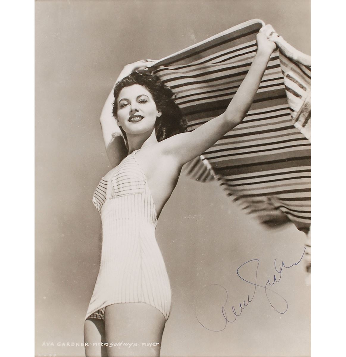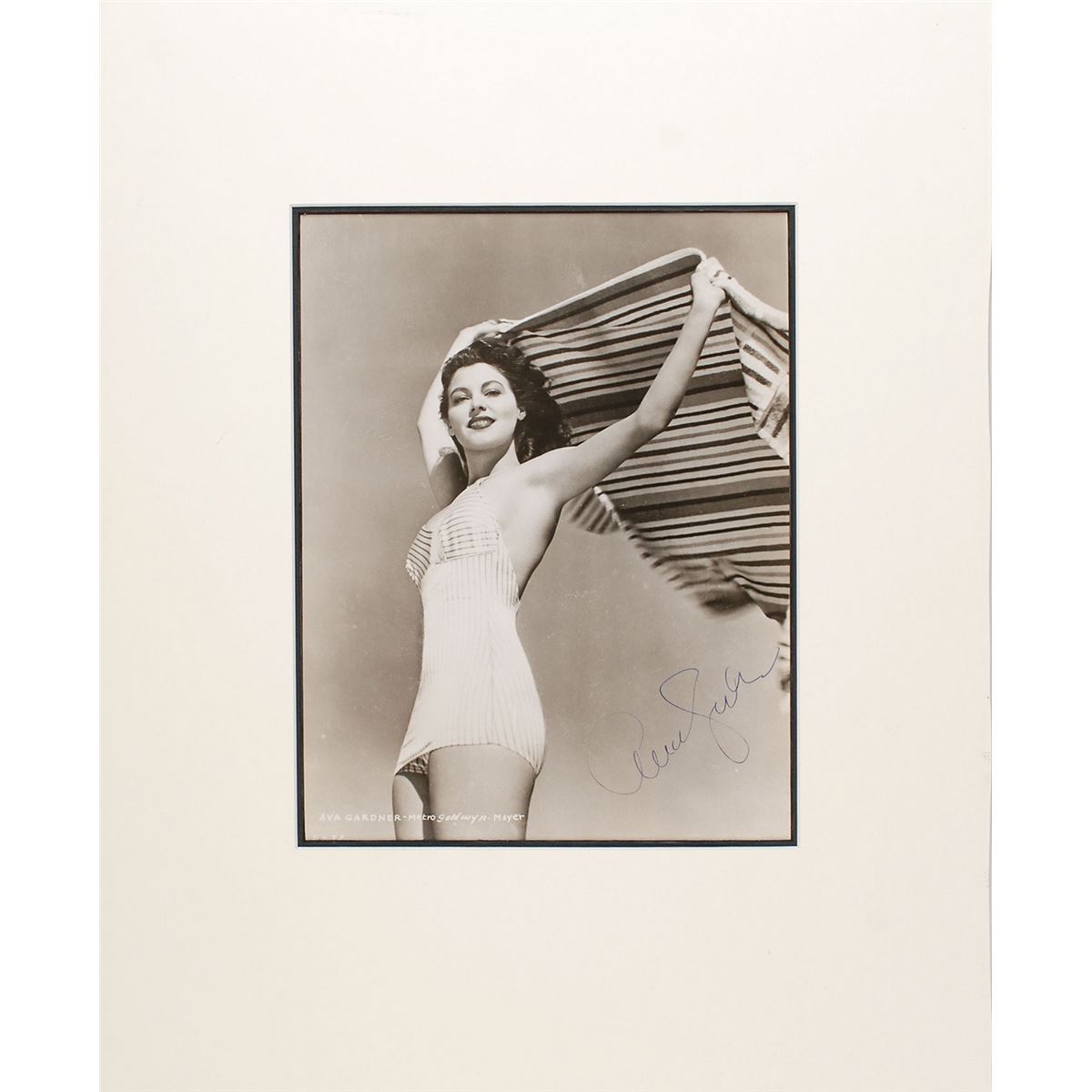 Attractive vintage glossy 7 x 9.25 MGM publicity photo of Gardner in a striped swimsuit, signed in blue ink. Double-matted to an overall size of 13 x 16. In fine condition, with the first letter of the signature a shade light.