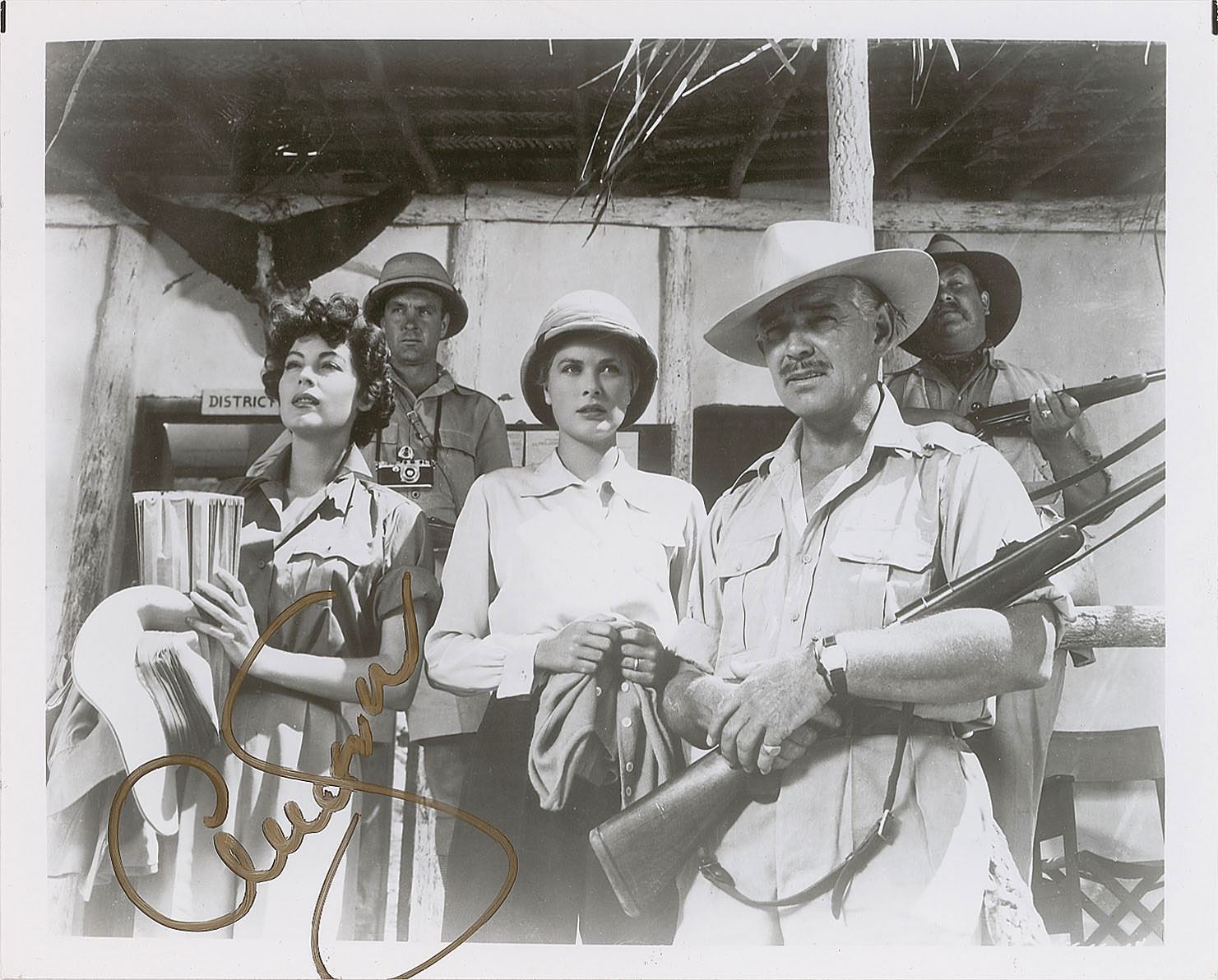 Two glossy photos, 8 x 10 and 10 x 8, both depicting Gardner as Eloise 'Honey Bear' Kelly from the 1953 John Ford film Mogambo, signed in gold ink and black felt tip, with Gardner adding "Best wishes" to one. In overall fine condition.