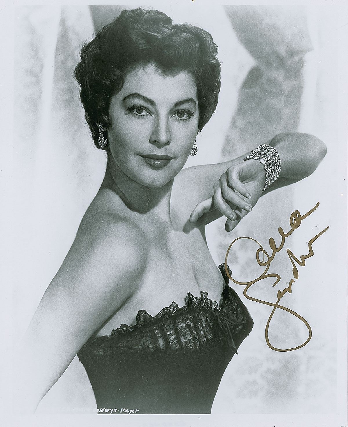 Attractive glossy 8 x 9.75 photo of Gardner in her MGM heyday, signed in gold ink. In fine condition.