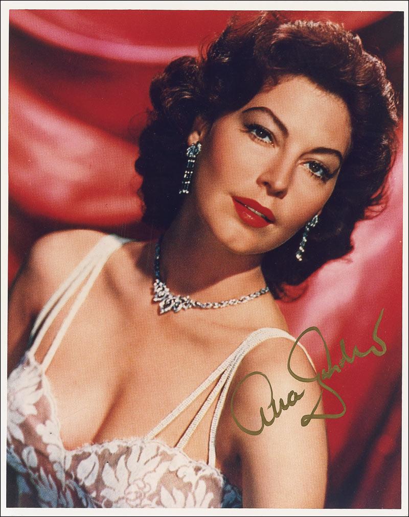 Eye-catching color glossy 8 x 10 photo of Gardner in a lace top, signed in gold ink. In fine condition, with a few light surface marks.