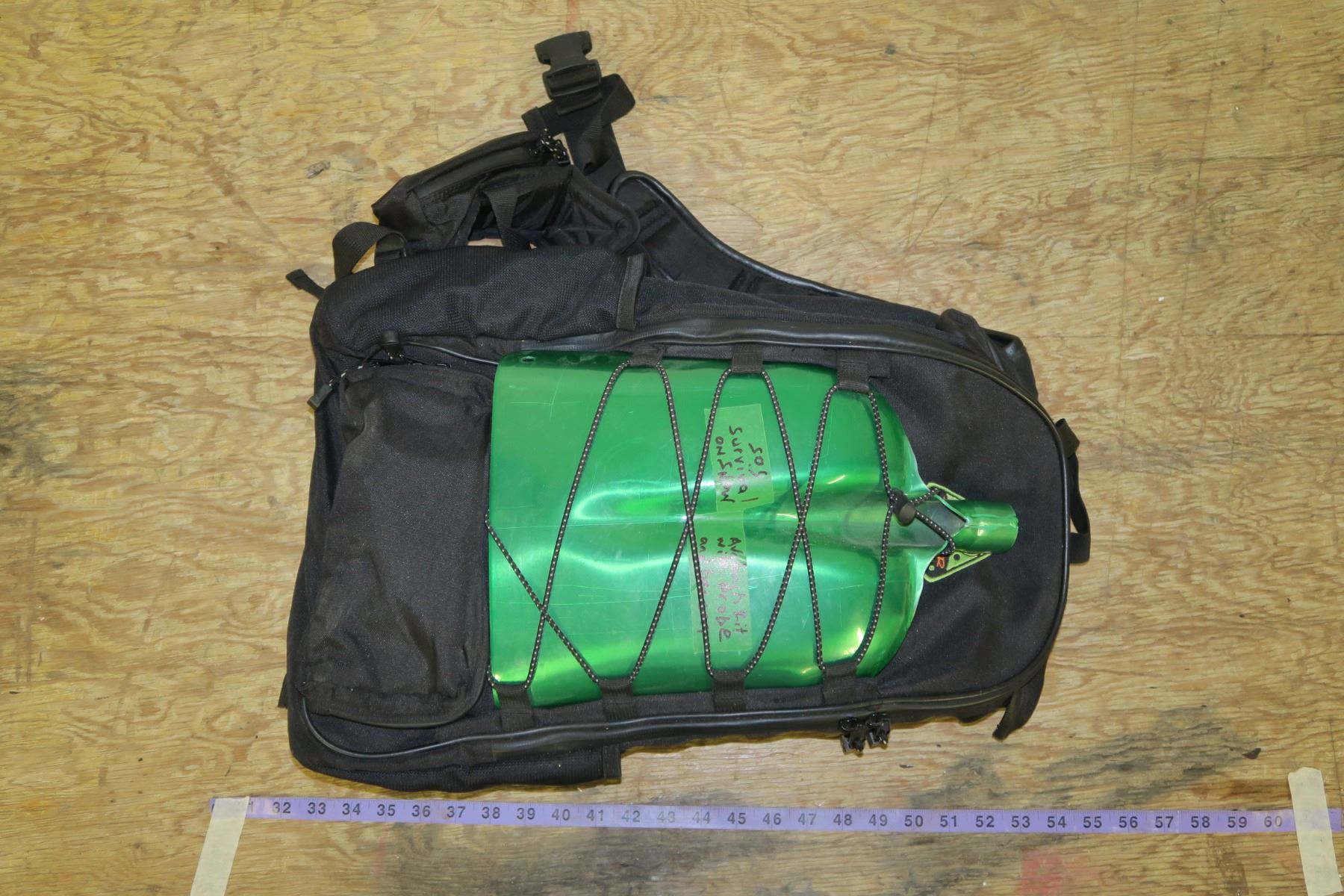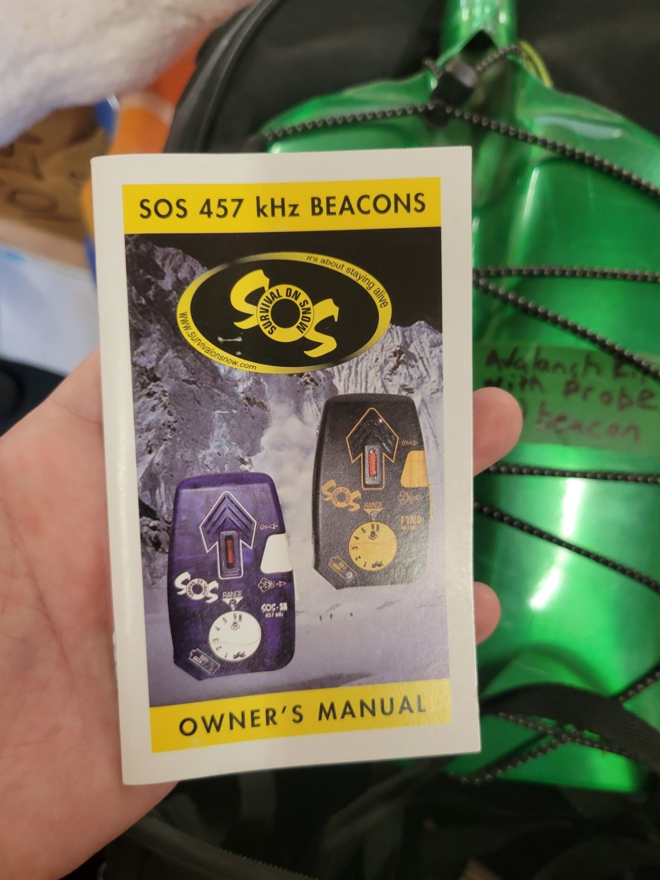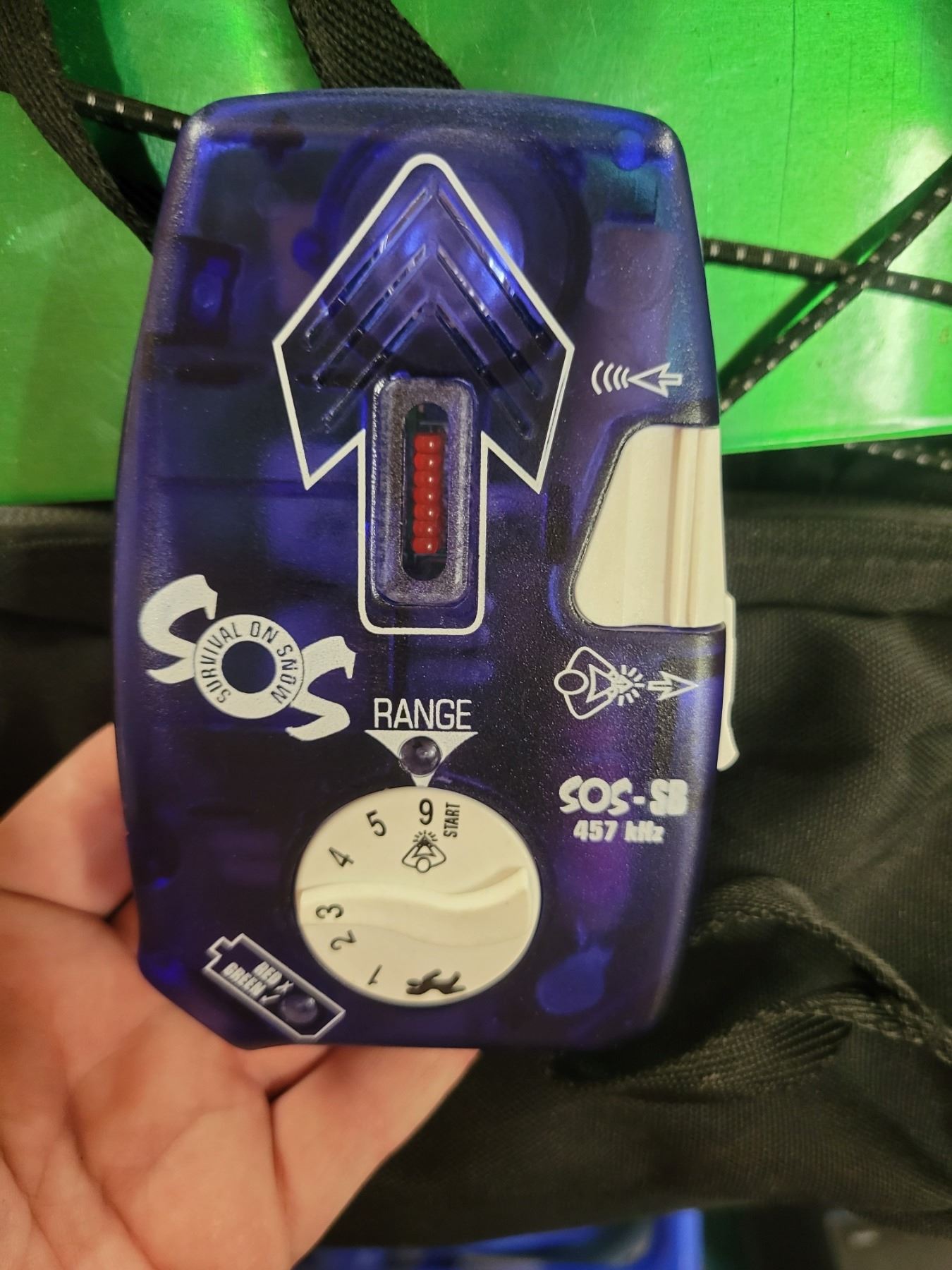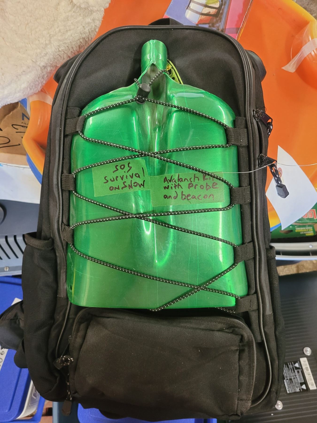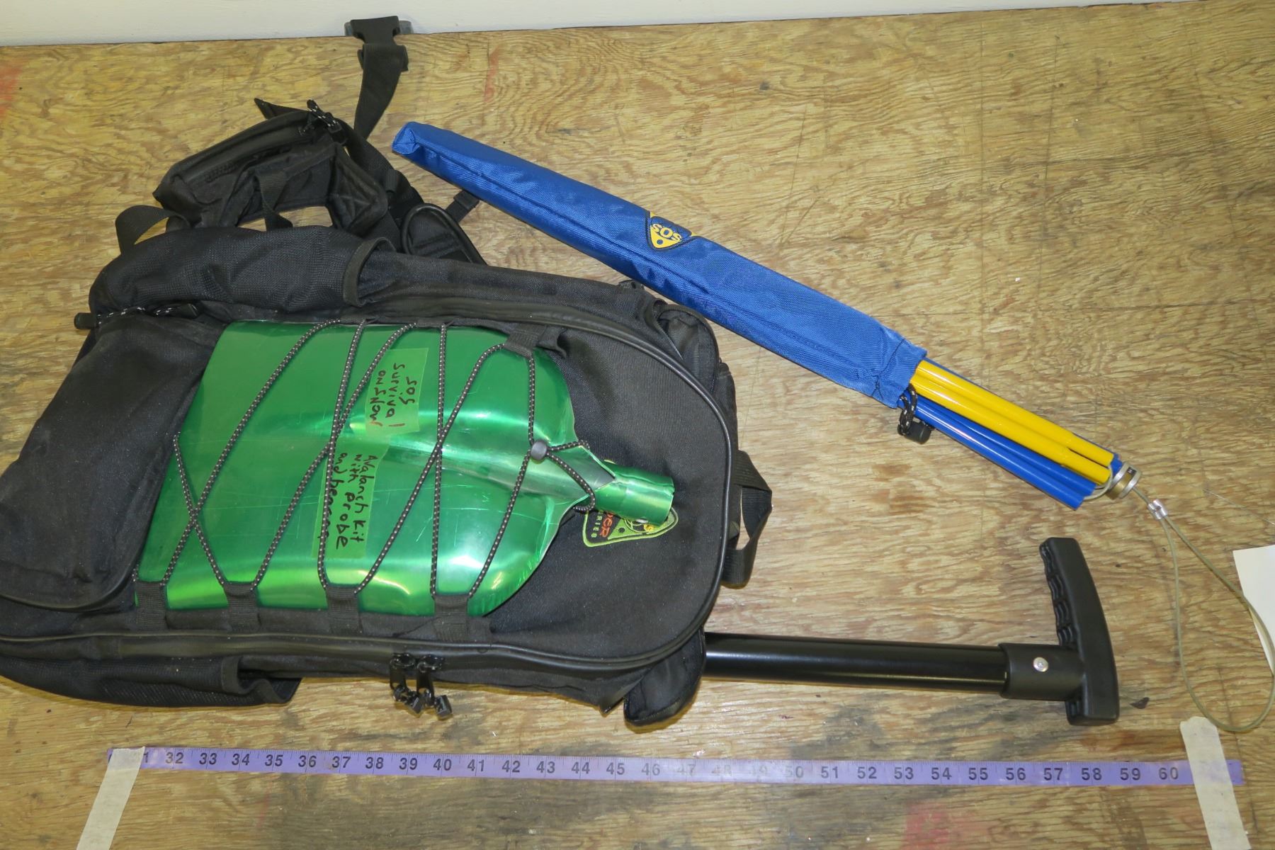 The front pocket of this backpack is an SOS avalanche beacon transceiver. Everyone in the group leaves theirs on send. When someone is buried everyone not buried turns their beacon to receive. When the signal is strongest you use the collapsible pole to poke for the buried person. Then grab the shovel and dig down to the person.