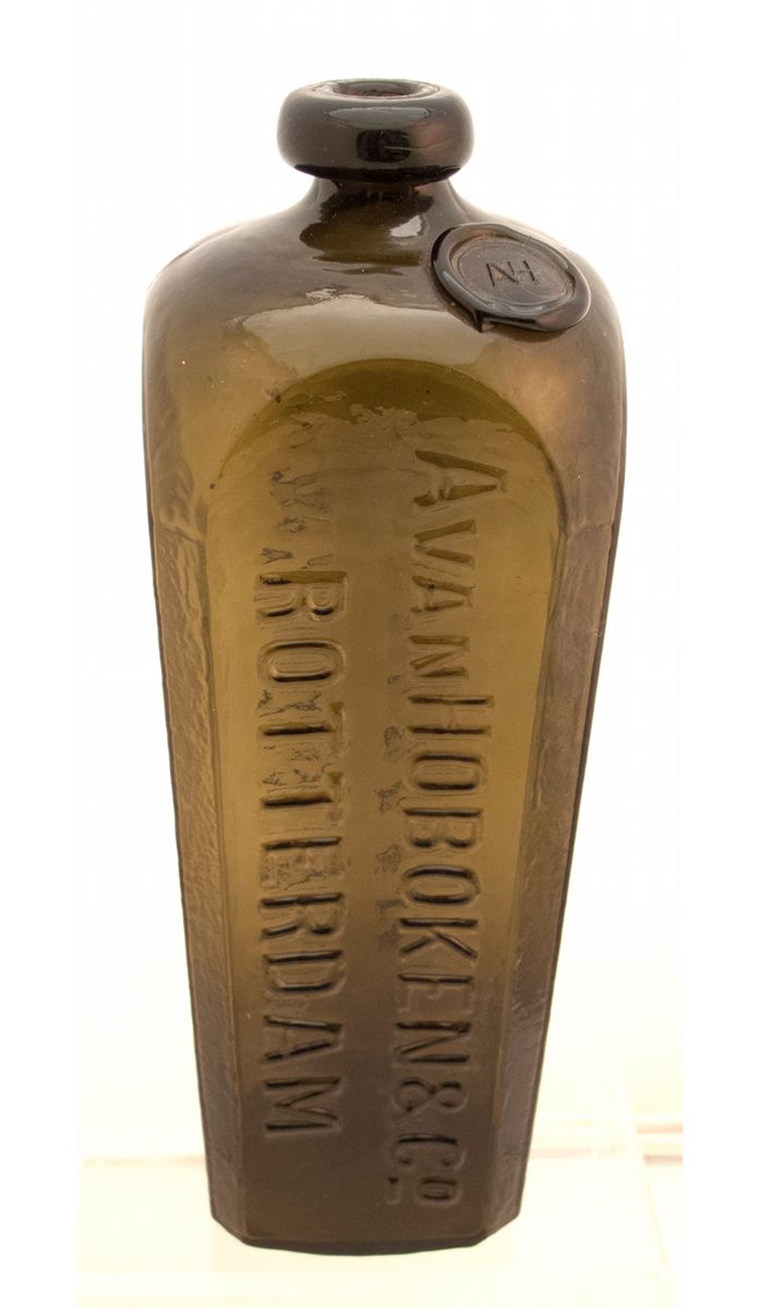1860's Avan Hoboken & Co Rotterdam embossed on both sides of an 11 inch tall deep olive green case gin bottle that is excellent condition. LOTS OF WHITTLE. Also embossed AH in the seal on the shoulder. From the collection of Adele Reed and one of her favorites.