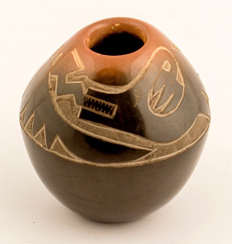Avanyu with feathers vase by Eric Tafoya. 3" h x 2.75" diameter. Eric Tafoya was born in 1969 into the Santa Clara-Tewa Pueblo. His interest in pottery was sparked at the age of 19 while watching his aunt, Gwen Tafoya, and his mother, Wanda Tafoya, coil pottery. The Tafoya family has been making pottery since the early 1900’s and the tradition is being carried on by Eric.Eric specializes in the traditional hand coiled Santa Clara pottery with the classic black finish usually etched or with added sgraffito designs. Eric also adds the flare of a burned red brim and hues to his work. He etches flowers, hummingbirds and designs of feathers on his pottery. Date: Location: Santa Clara Pueblo, New Mexico HWAC # 50778