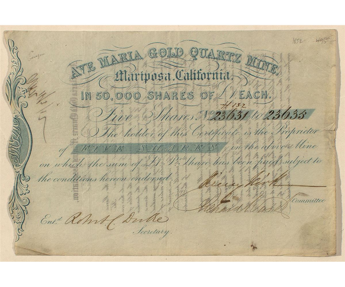 Incorporated in 1851. Issued in 1851. Signed by President Ryke and Secretary Robert Dude. Light blue paper with blue printing. 5 shares: numbers 23631 to 23635. Left edge is a wavy cut, right edge has some soiling on the reverse. 6.5" x 9.5" The Ave Maria's place is verified by a letter written from John Duncan to John Fremont on December 26, 1851. In the letter he clearly states that the Ave Maria is located on the Mariposa Estate and on the Ave Maria River. [Ref: The Expeditions of John Charles Fremont, Volume 3, edited by Spence]. Today the Ave Maria River is known as the Stockton Creek [Ref: Gudde]. There was a small town by that name at the confluence of the Ave Maria and Mariposa. (Prag Collection)