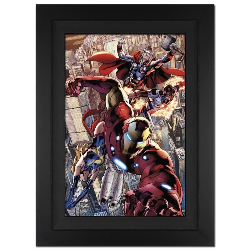 A piece of comic book history, this limited edition, from original art by Bryan Hitch, depicts an adventure packed scene starring Iron Man, Ms. Marvel, Protector and Thor. British artist Bryan Hitch was inspired by comic books at an early age. Not only has Hitch worked on the The Avengers, Captain America, and She-Hulk, but he also did the character design for the Ultimate Avengers and Ultimate Avengers 2 animated films. "Avengers #12.1" is an extremely limited edition giclee on canvas by Bryan Hitch presented by Marvel Comics, hand signed by the great Stan Lee and numbered out of only 10! This piece comes custom framed and ready to hang. Includes Certificate of Authenticity! Measures approx. 25" x 34" (with frame), 18" x 27" (image).