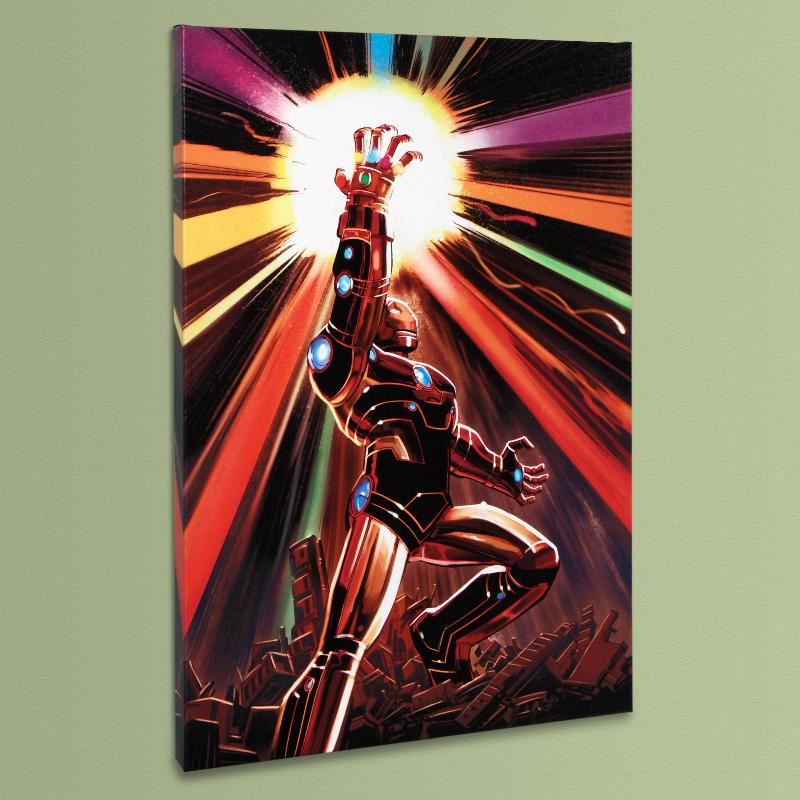 A piece of comic book history, this limited edition, from original art by John Romita Jr., depicts the heroic Iron Man. John Romita Jr. began his career at Marvel UK, doing sketches for covers of reprints. His American debut was with a six-page story entitled "Chaos at the Coffee Bean!" in The Amazing Spider-Man Annual #11 in 1977. His early popularity began with his run on Iron Man in 1978. Since then he has worked on many other comic book series including Thor, Fantastic Four, Daredevil and X-Men. "Avengers #12" is a limited edition numbered giclee on canvas by John Romita Jr. presented by Marvel Comics. This piece comes gallery wrapped. Includes Certificate of Authenticity! Measure approx. 18" x 27" (image).