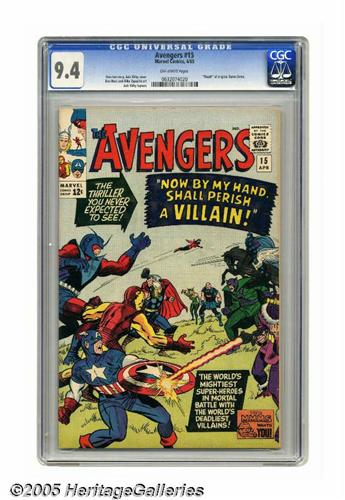 <B>Avengers #15 (Marvel, 1965) CGC NM 9.4 Off-white pages.</B></I> The death of Baron Zemo is the landmark event in this issue. And yes, he really stayed dead, though his son and at least one impostor would take on the name later. Zemo, already responsible for the death of Captain America's sidekick Bucky, pushed his luck in this issue by kidnapping Cap's new teen pal, Rick Jones. Jack Kirby drew this issue's cover as well as providing interior layouts for Don Heck to finish. Overstreet 2005 NM- 9.2 value = $225. CGC census 4/05: 13 in 9.4, 5 higher.