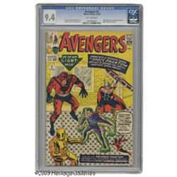 <B>Avengers #2 (Marvel, 1963) CGC NM 9.4 Off-white pages.</B></I> Surprisingly, after just one book into the series, the Hulk leaves the team in this issue. This also marks the first appearance of the Space Phantom. Stan Lee wrote the story, and Jack Kirby provided the cover. Kirby and Paul Reinman handled interior art. Only two copies have currently received a higher grade from CGC. Overstreet 2004 NM- 9.2 value = $1,050. CGC census 1/05: 8 in 9.4, 2 higher.