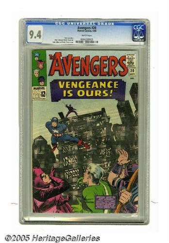 <B>Avengers #20 (Marvel, 1965) CGC NM 9.4 White pages.</B></I> Jack Kirby's covers make the earliest issues of Marvel's superteam highly prized. A bonus with this issue is Wally Wood's inking help on the cover and interior. Overstreet 2005 NM- 9.2 value = $110. CGC census 1/05: 13 in 9.4, 7 higher.