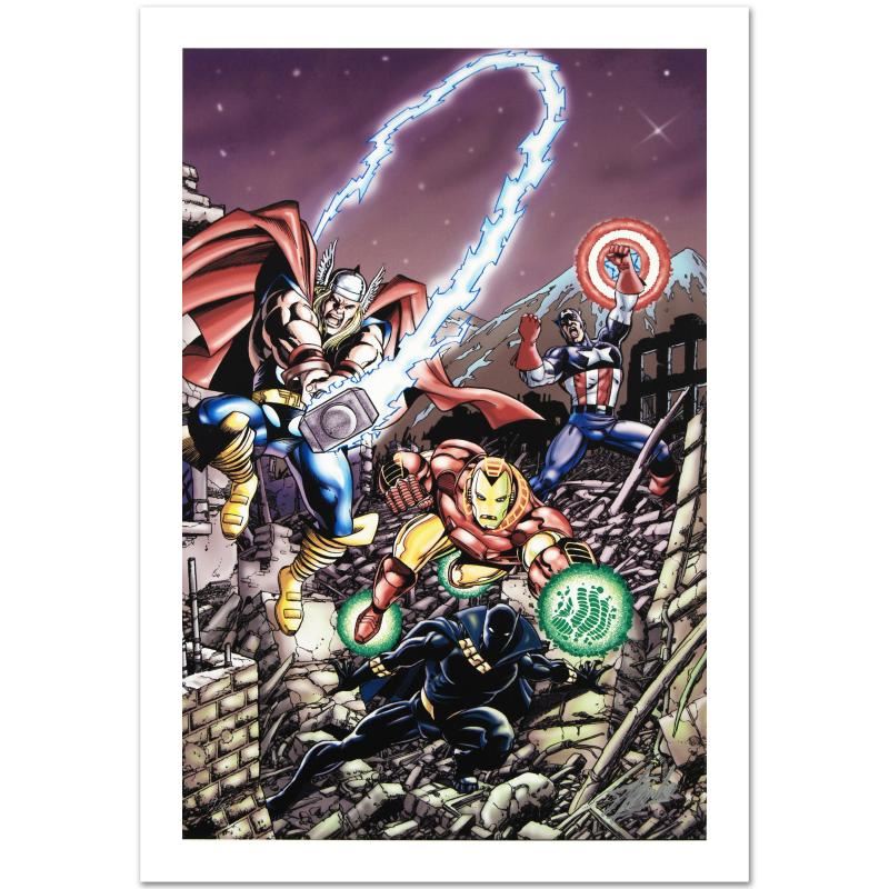 A piece of comic book history, this limited edition, from original art by George Perez, depicts the mighty Avengers. Puerto Rican artist George Perez gained renown within the industry by illustrating The Avengers in a style reminiscent of Jack Kirby. He has since illustrated many titles for both Marvel and DC Comics, including Hulk and X-Men. "Avengers #21" is a numbered limited edition giclee on canvas by George Perez presented by Marvel Comics and hand signed by the great Stan Lee! Includes Certificate of Authenticity! Measures approx. 18" x 27" (image). Please allow 5 additional business for items that include canvas stretch or framing.