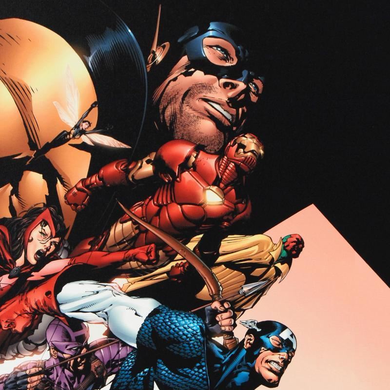 A piece of comic book history, this limited edition, from original art by David Finch, depicts Captain America and other characters from the Marvel Universe. In 2003, Finch came to Marvel Comics for a year-long arc on Ultimate X-Men, after which he began work on The Avengers and thereafter The New Avengers. He has also worked on such titles as Captain America, Spider-Man and the Hulk. "Avengers #500" is a limited edition numbered giclee on canvas by David Finch presented by Marvel Comics. This piece comes gallery wrapped. Includes Certificate of Authenticity! Measure approx. 18" x 27" (image).